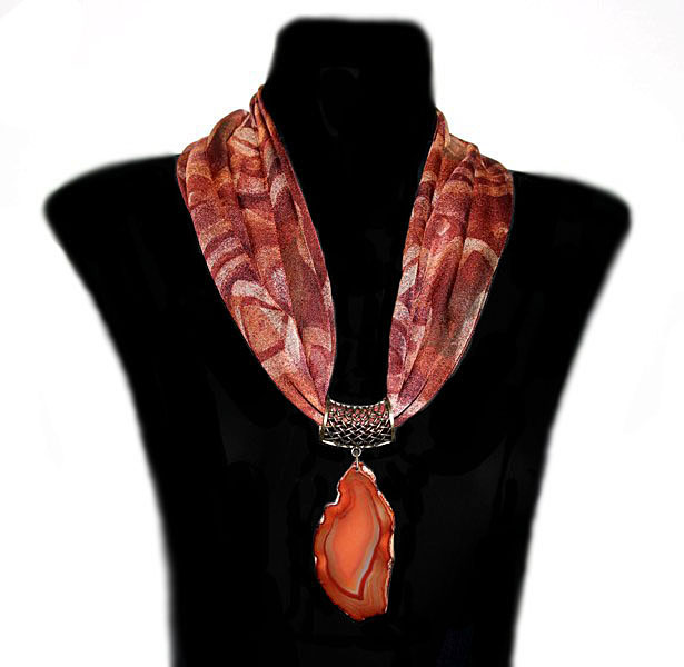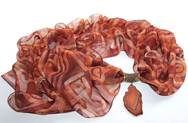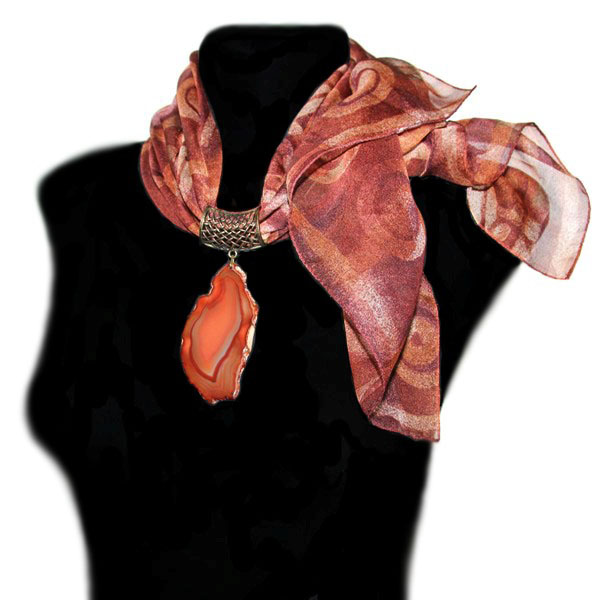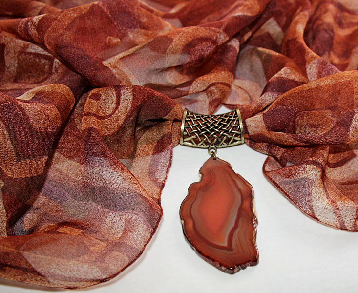 Terrakotavärvi kirjust polüesterkangast õhuke sall antiik-kuldset värvi võrgumustrilise sallihoidja ja kauni looduslikust ahhaadist ripatsiga. Lihvitud pealispinnaga terrakotavärvi toonitud suuremat sorti ahhaatkivi mõõdud on 4 cm x 8 cm. Kaunilt langeva õhulise ja etnomustrilise salli laius on 38 cm, pikkus 160 cm.