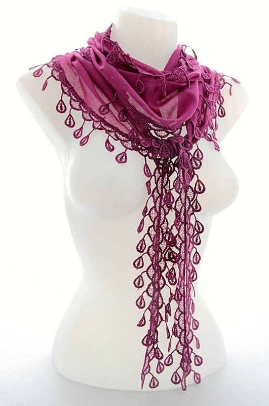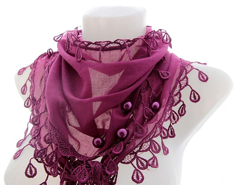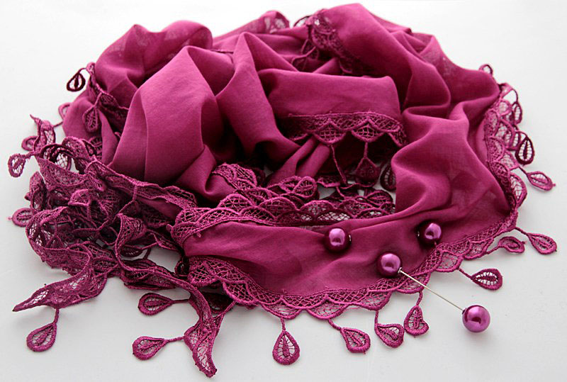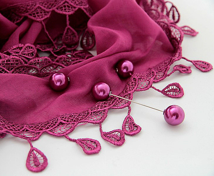 Bordoopunane pitsäärtega sall pärlkaunistusnõelte ja komplektis kahepoolsete kõrvarõngastega