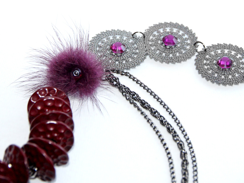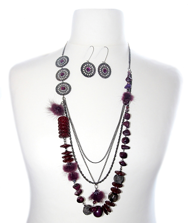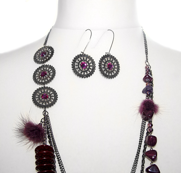 Hematiidi- ja bordoovärvi detailidega ehtekomplekt mitmekihilise kaelakee ja pitsilistest ripatsitest kõrvarõngastega.