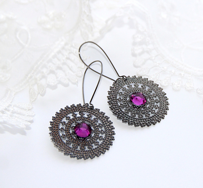 Komplekti kuuluvate pitsiliste filigree-ripatsitega kõrvarõngaste pikkus koos hematiidivärvi kidney-haagiga on 6 cm. Metall-filigreede diameeter on 3 cm. Filigreed on ilukividega kaunistatud mõlemalt poolt.