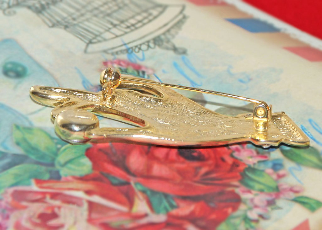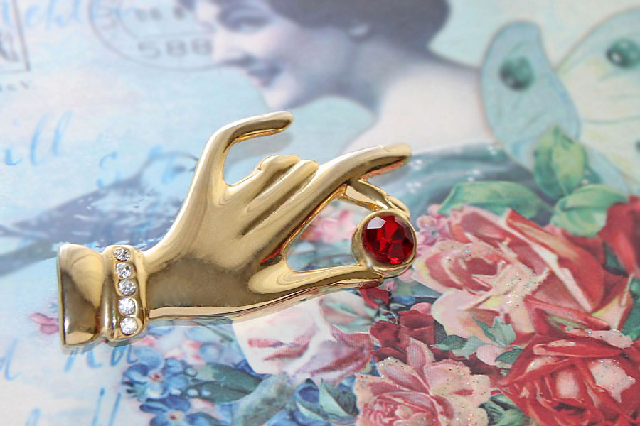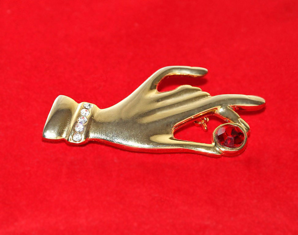 Särava suure punase ja väikeste valgete klaaskristallidega daami käe motiiviga elegantne pross.