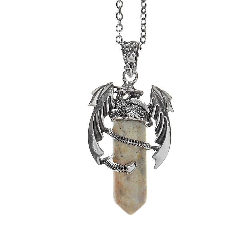 Efektse antiikhõbedavärvi draakonikujulise metallkaunistuse ning pastelse kreemika tooniga puuahhaadi tahulise ripatsiga kaelakett.