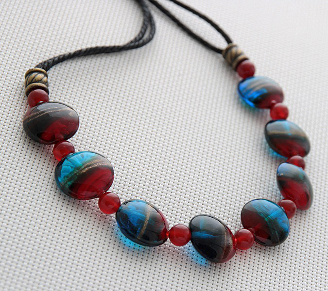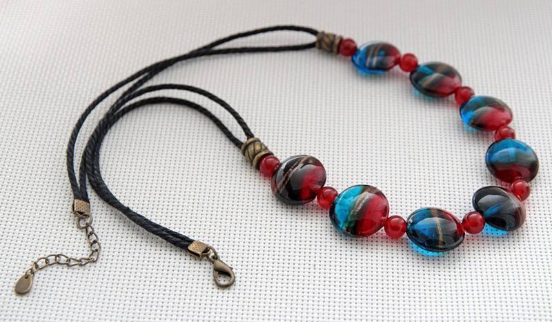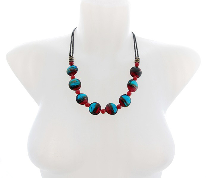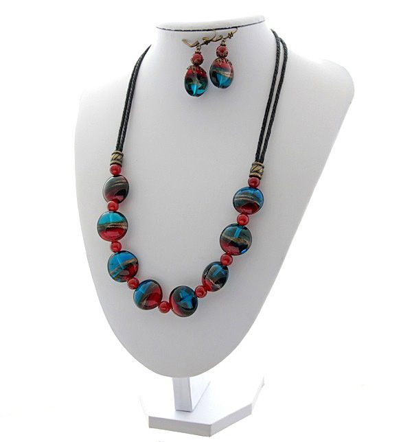 Punastes-sinistes toonides poolläbipaistvate käsitööklaasist lapikute helmeste, punakas-pruunide ahhaathelmeste ning pronksivärvi kaunistusdetailidega ehtekomplekt kaelakee ja kõrvarõngastega. Helmeste ja kahe musta puuvillanööriga kaelakee pikkus on reguleeritav karabiinhaagi ja pikendusketiga 57 cm-st kuni 61 cm-ni. Helmestega osa pikkus on 24 cm. Kõrvarõngaste pikkus koos inglise lukuga on 4,5 cm