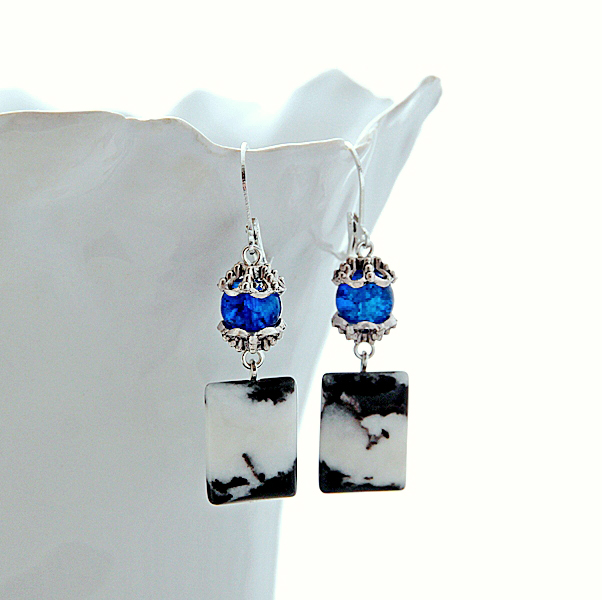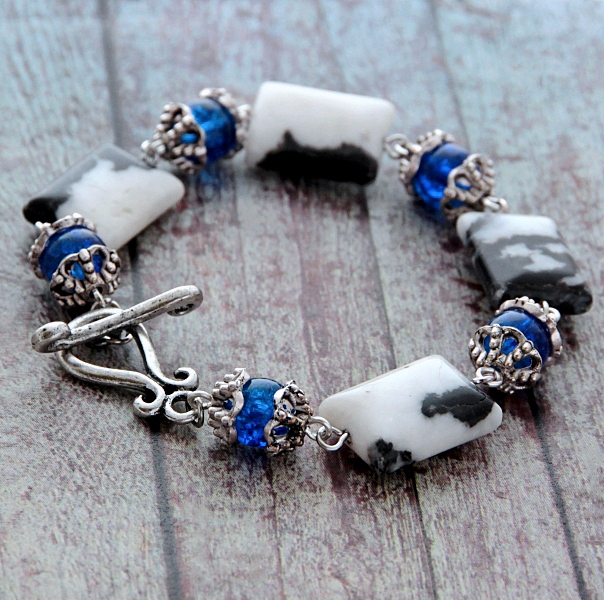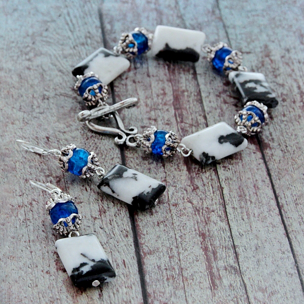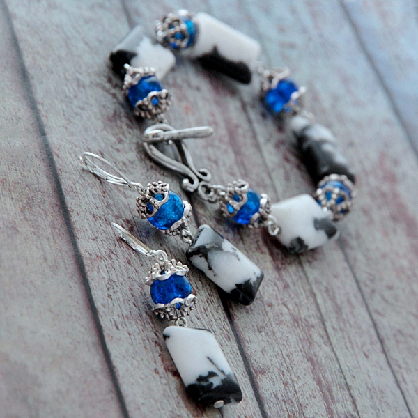 Musta-valgekirjute loodusliku ahhaadi helmeste, erksiniste “mõraliste” klaashelmeste ja antiikhõbedavärvi kaunistusdetailidega ehtekomplekt käevõru ja kõrvarõngastega