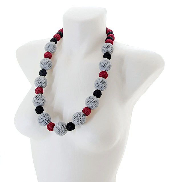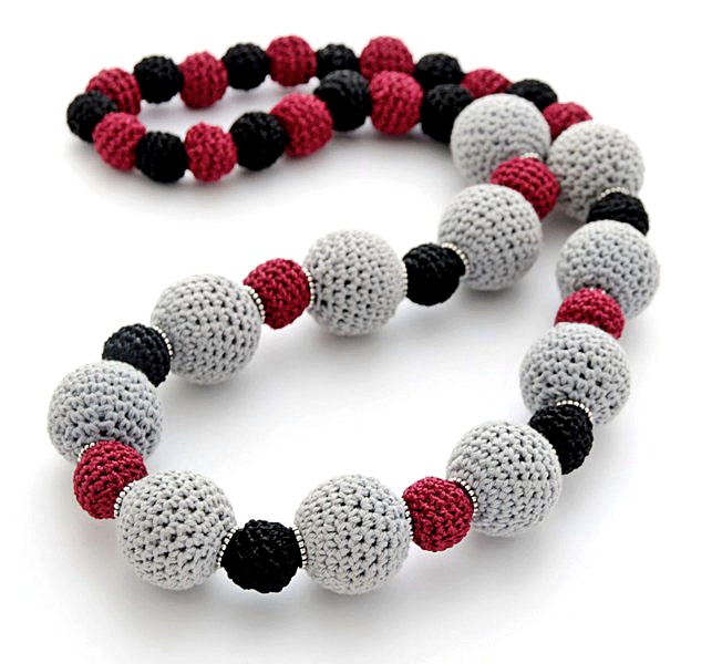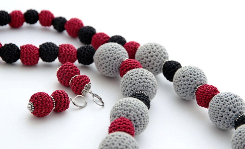 Suurte heegeldatud helmeste sees on vahtplastist ümmargused detailid, väikeste sees kerged läbipaistvad akrüülhelmed. Heegeldatud hallide helmeste suurus on 2,8 cm, punaste ja mustade helmeste suurus on 1,2 – 1,5 cm.