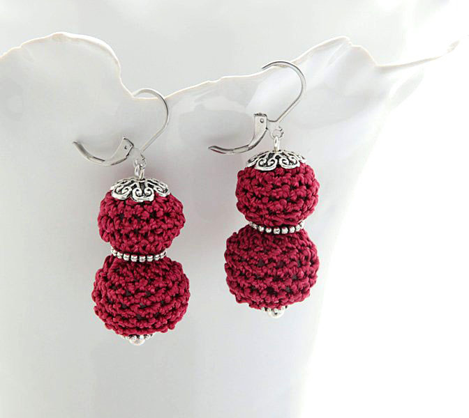 Kahe väikese veinipunase heegeldatud helme ning inglise luku ja antiikhõbedavärvi kaunistusdetailidega kõrvarõngaste pikkus koos lukuga on 4,7 cm.