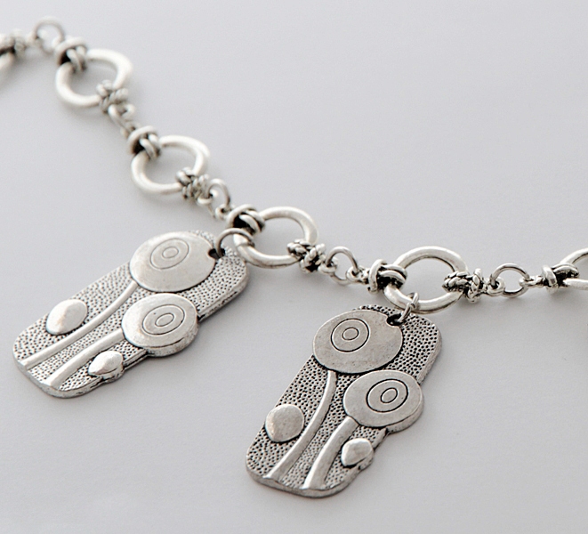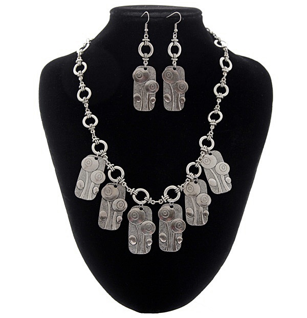 Stiliseeritud roosimotiividega reljeefsete neljakandiliste metallripatsitega antiikhõbedavärvi ehtekomplekt kaelakee ja kõrvarõngastega. Karabiinhaaki on võimalik kinnitada igasse ketilülisse ning pikkust reguleerida kuni 50 cm-ni. Ripatsitega osa laius on 16 cm.