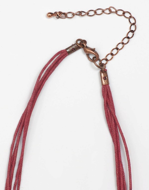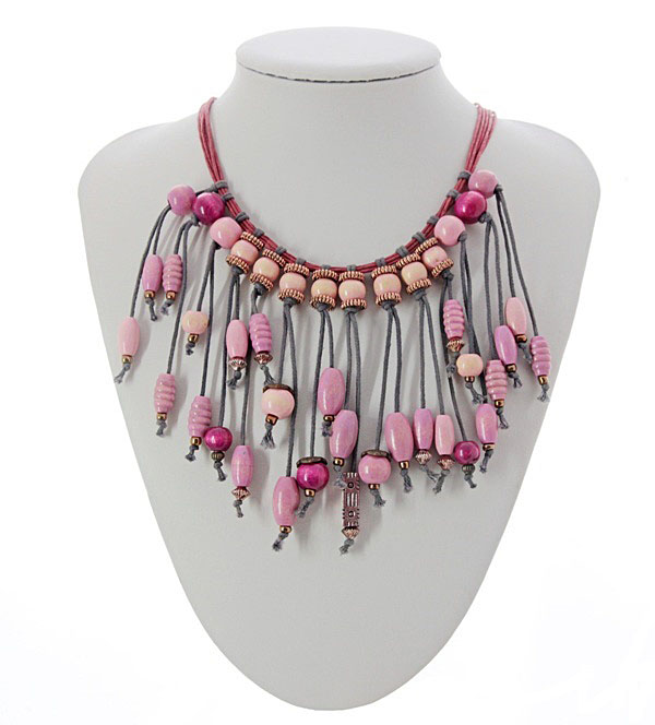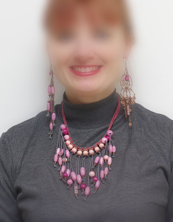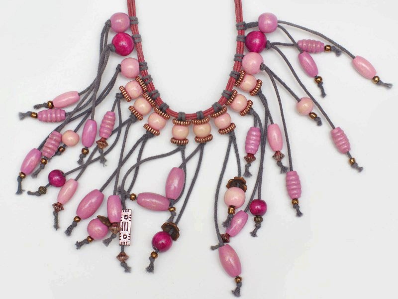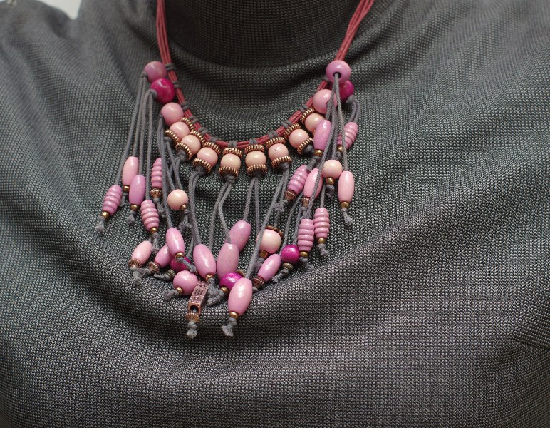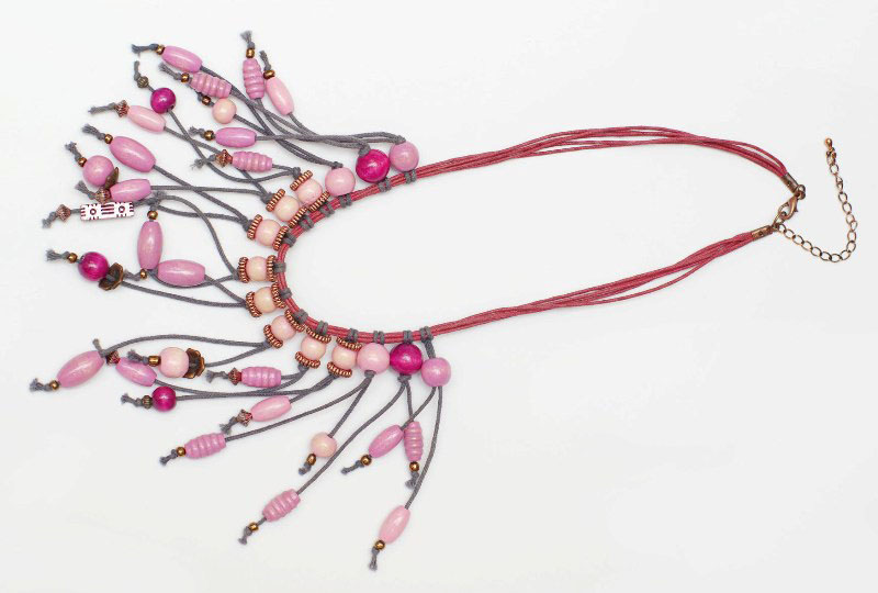 Vasevärvi kaunistusdetailide, erineva kuju ja värvitooniga roosade puuhelmeste ning puuvillanööridega ehtekomplekt kaelakee ja kõrvarõngastega. Kaelakee ripatsid koos helmestega on halli nööriga sõlmitud ühekaupa tumepunasele viiekihilisele puuvillanöörile. Kaelakee pikkus on reguleeritav väikese vasevärvi karabiinhaagi ja lõpetusketiga 43 cm-st kuni 50 cm-ni. Helmestega osa laius on 14 cm.