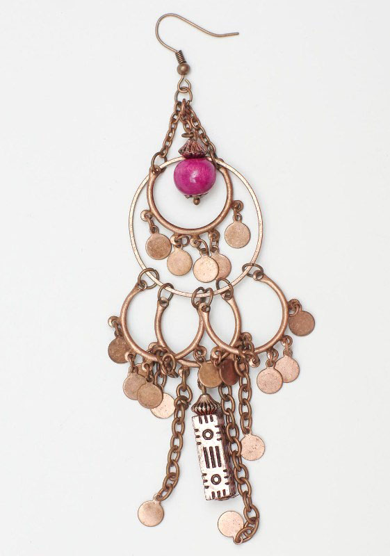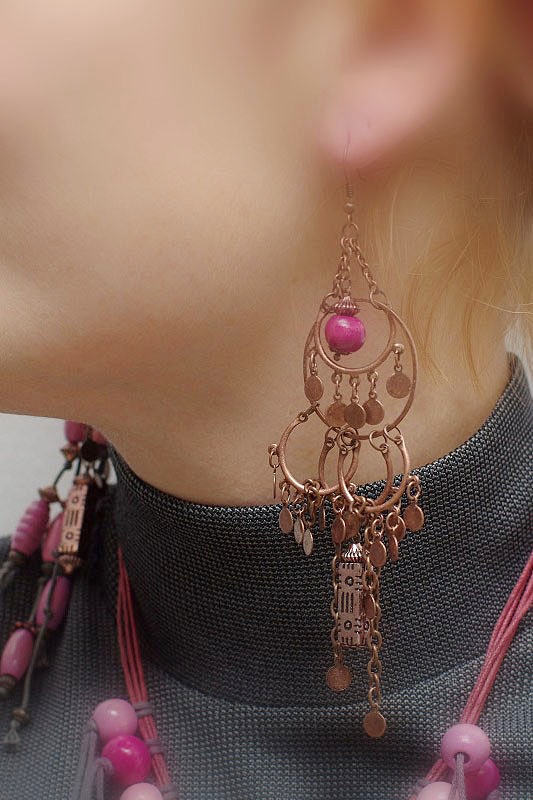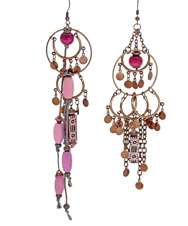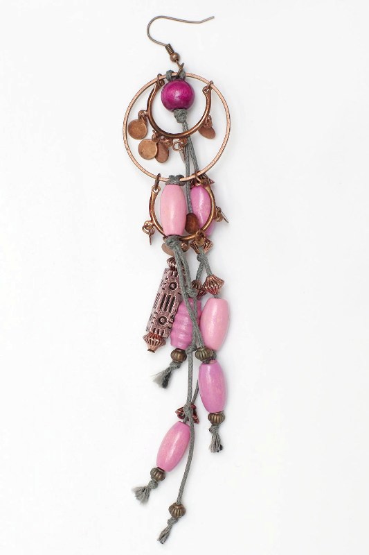 Pikad vasevärvi kõrvarõngad on taotluslikult erinevad. Kõrvarõngapaaris on kombineeritud erinevaid roosasid puuhelmeid, halli nööri, vasevärvi metallripatseid ja -kette ning kergest akrüülist kaunistusdetaile. Kõrvarõngaste pikkused koos vasevärvi konksuga on 13,5 cm ja 16 cm.