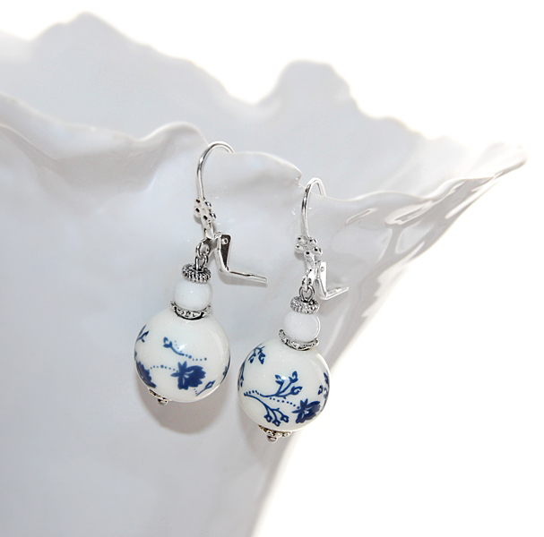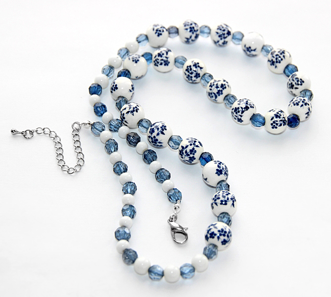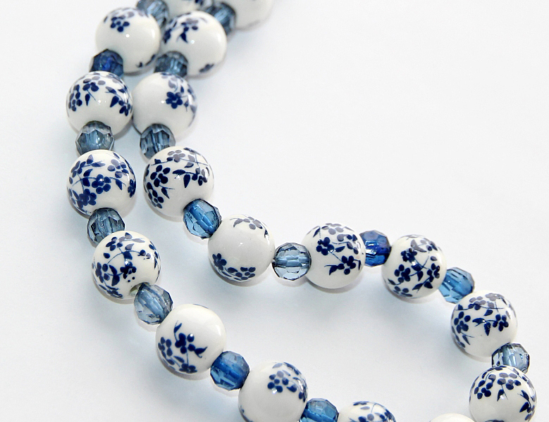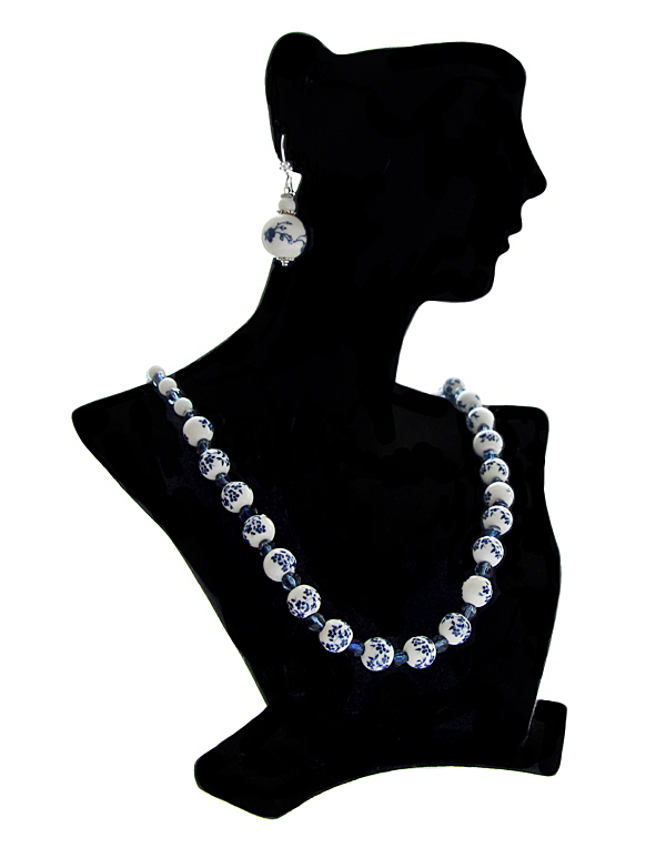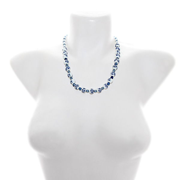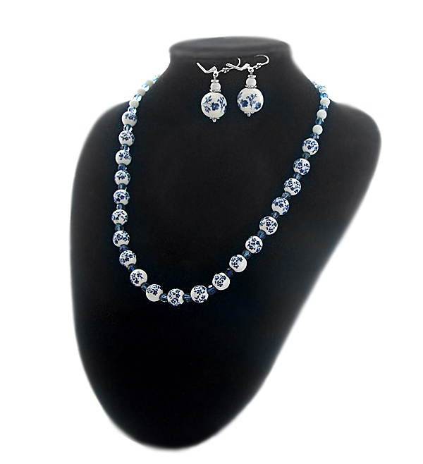 Väikeste valgete klaashelmeste, läbipaistvate tumesiniste akrüülhelmeste ja lillemustriliste portselanhelmestega ehtekomplekt kaelakee ja kõrvarõngastega. Kaelakee pikkus on reguleeritav väikese hõbedavärvi karabiinhaagi ja ketiga 51 cm-st 56 cm-ni. Lillemotiiviga inglise luku ja hõbedavärvi kaunistusdetailidega kõrvarõngaste pikkus on 4,3 cm.