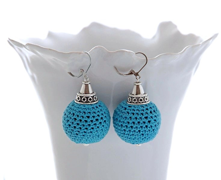 Ehtekomplekt taevasiniste heegeldatud helmeste ja hõbedavärvi metalldetailidega