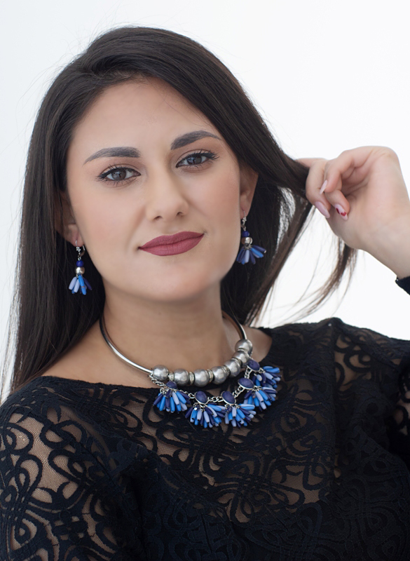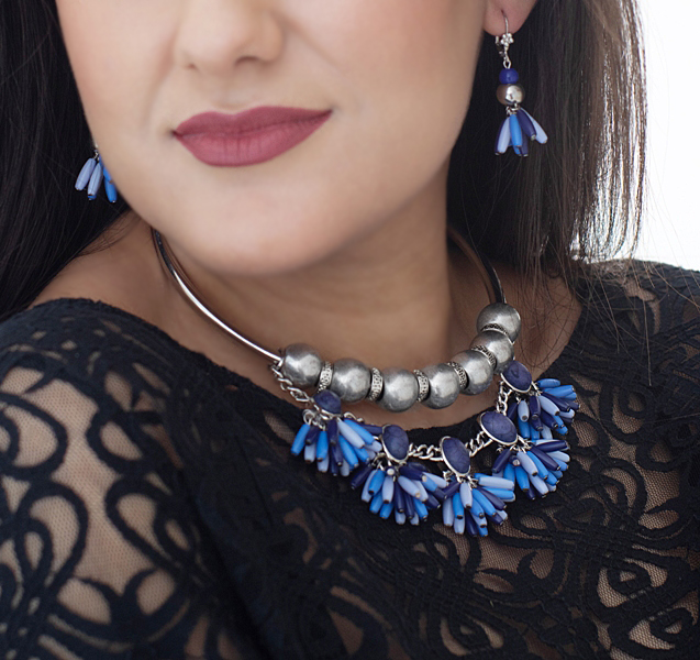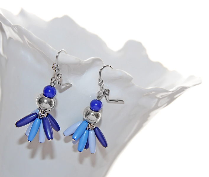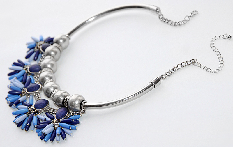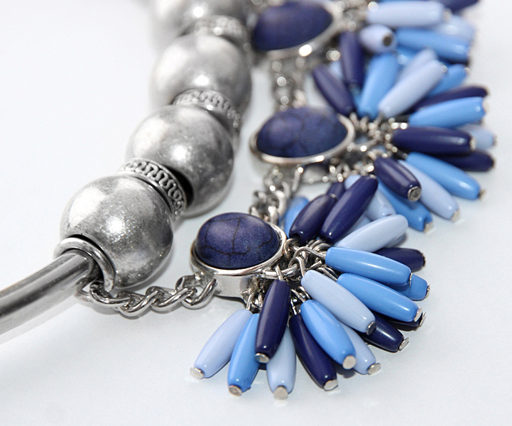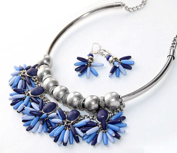 Hõbedavärvi metallhelmeste ja stiliseeritud rukkilillemotiividest ripatsitega ehtekomplekt kaelavõru ja kõrvarõngastega. Efektsel metallist võrul on kaunistuseks suure auguga metallhelmed ning ketiga ühendatud erinevat tooni siniste piklike akrüülhelmeste kobarad. Helmeste kobarad on kahes kihis kinnitatud tumesinise akrüülkameega kaunistatud metallalustele.
