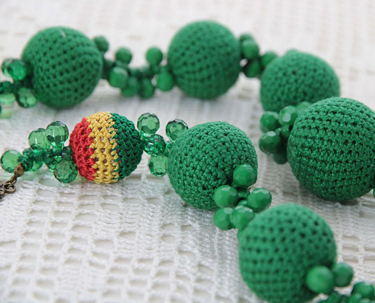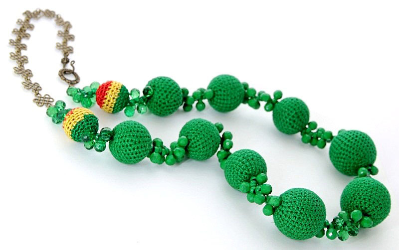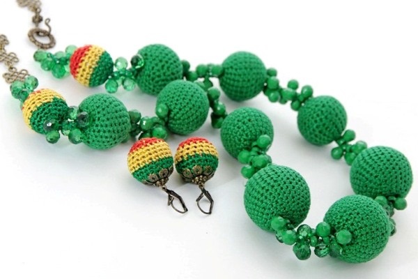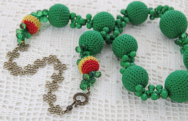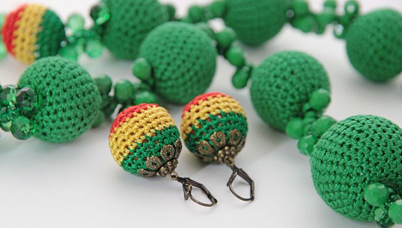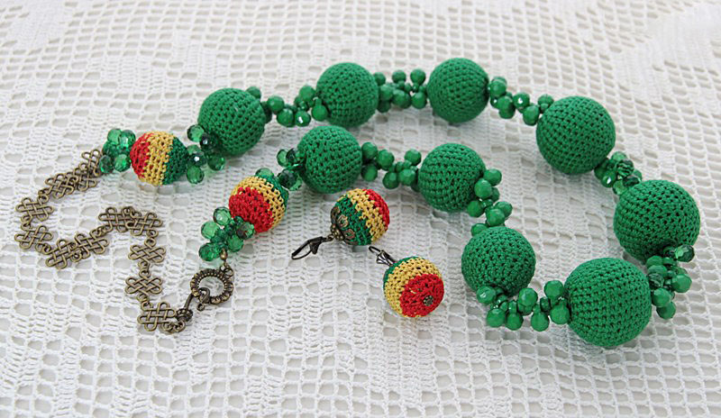 Suurte roheliste ja rohelise-kollase-punasetriibuliste heegeldatud helmeste, läbipaistvate ja mattide roheliste akrüülhelmeste ning pronksivärvi kaunistusdetailidega ehtekomplekt.