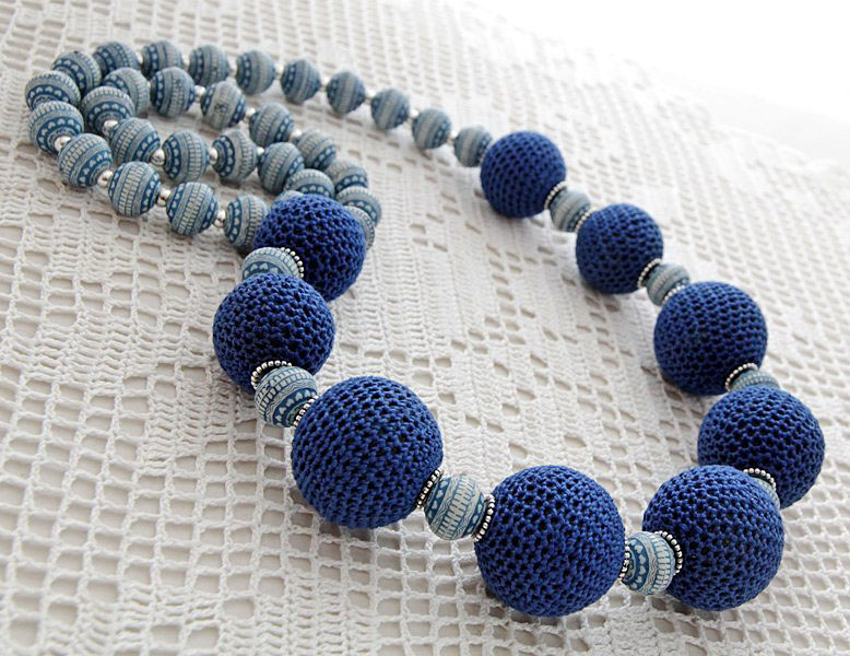 Ehtekomplekt suurte siniste heegeldatud helmeste, hõbedavärvi kaunistusdetailide ja sinisekirjute akrüülhelmestega. Rahvuslikus stiilis ehtekomplekti kuulub kaelakee pikkusega (ümbermõõduga) 74 cm ja hõbedavärvi inglise lukuga kõrvarõngad pikkusega 7 cm. Heegeldatud helmeste sees on vahtplastist ümmargused detailid, mistõttu helmed on ka väga kerged. Heegeldatud helmeste diameeter on 28mm, etnomustriliste akrüülhelmeste diameeter on 14mm
