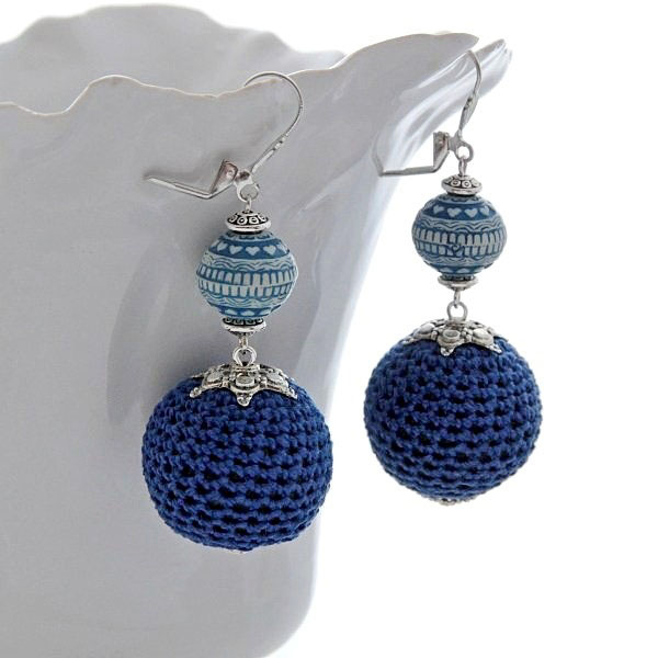 Suurte siniste heegeldatud helmeste, hõbedavärvi kaunistusdetailide ja sinisekirjute akrüülhelmestega ehtekomplekt