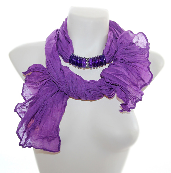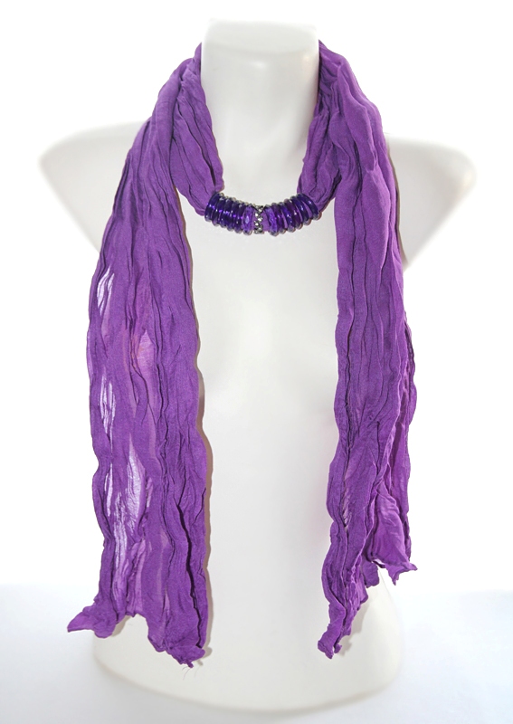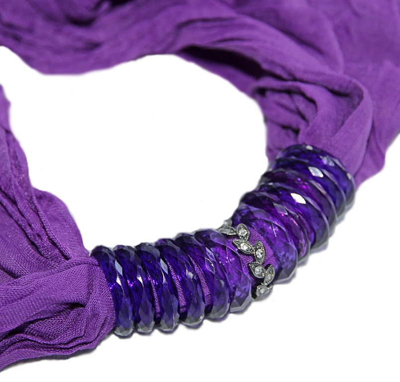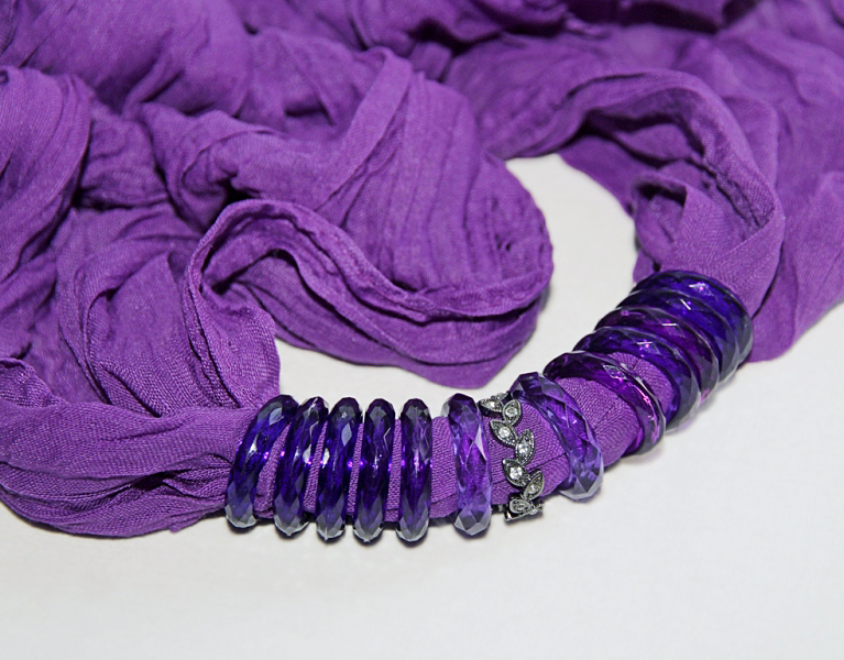 Erklillast viskooskangast pikk sall efektsete lillade akrüülist ja hematiidivärvi metallist kaunistusrõngastega. Kahes erinevas toonis pool-läbipaistvad lillad sallirõngad on kerget sädelust tekitava tahulise pinnaga, hematiidivärvi lehemotiividest rõngas on kaunistatud väikeste valgete klaaskristallidega.