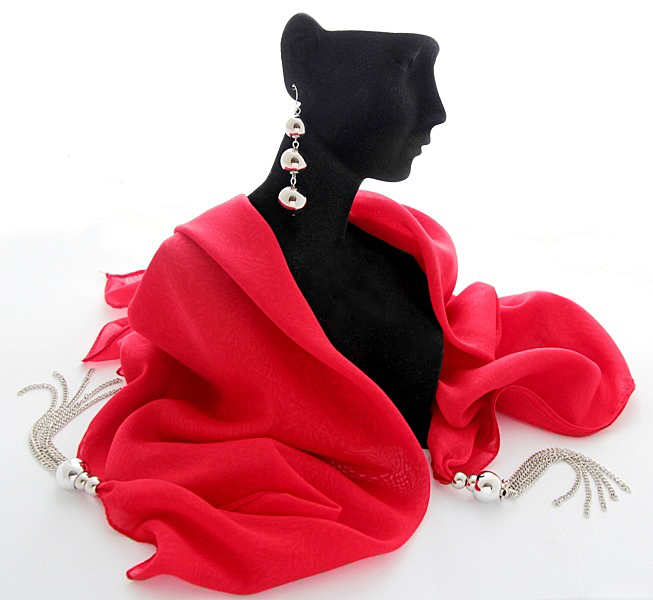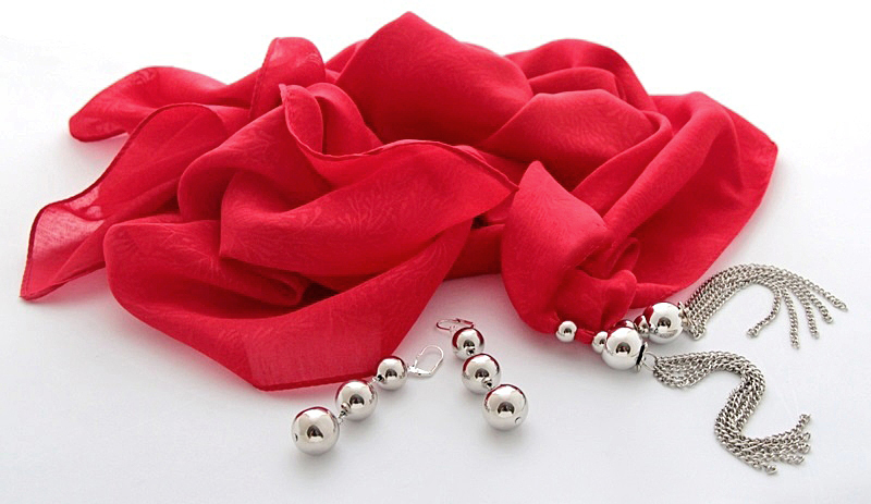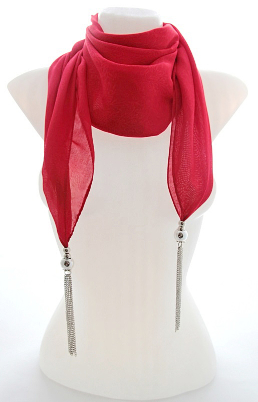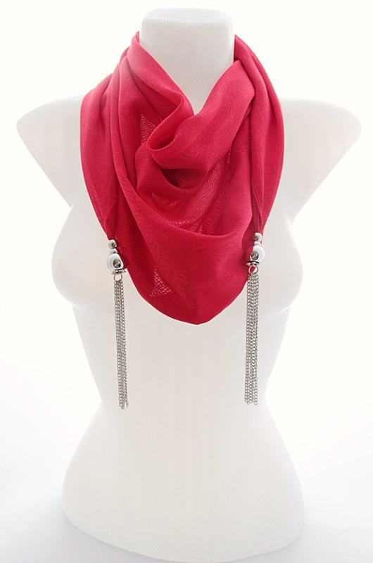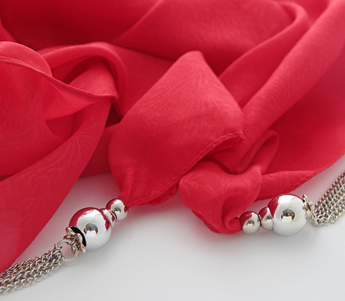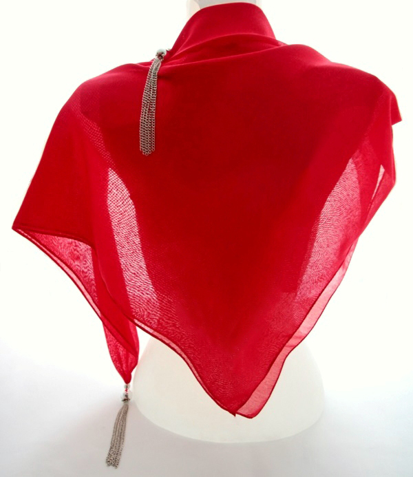 Erkpunasest viskooskangast kaelarätik hõbedaste metallhelmeste ja kettidega. Ruudukujuline rätik on kolmnurkselt kokku volditud ning otstesse on kinnitatud hõbedased metallhelmed ja pikad ketid. Kaelarätiku diagonaali pikkus on 135 cm, otsakaunistuse pikkus on 16 cm.