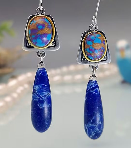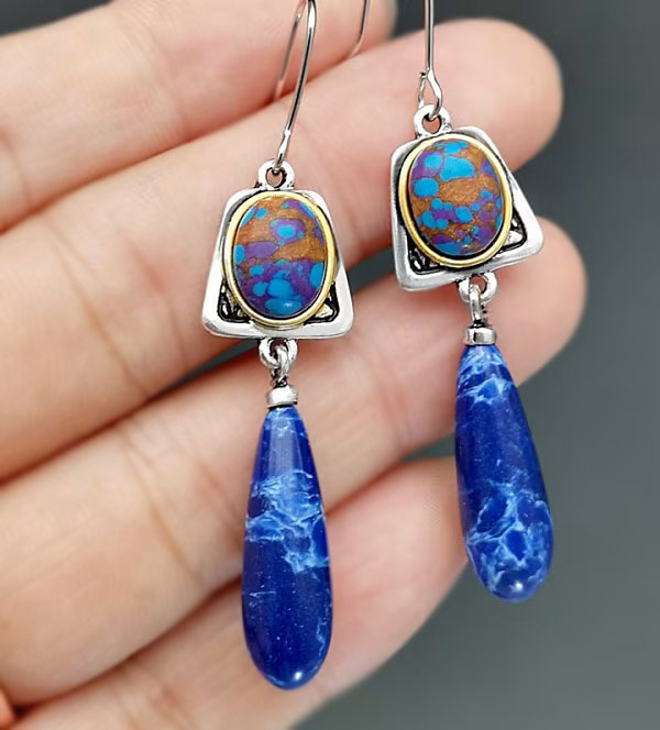 Antiikõbedavärvi metalldetailidega etno stiilis kõrvarõngad poolvääriskive meenutavate kirjute kameede ning erksiniste tilkadega.