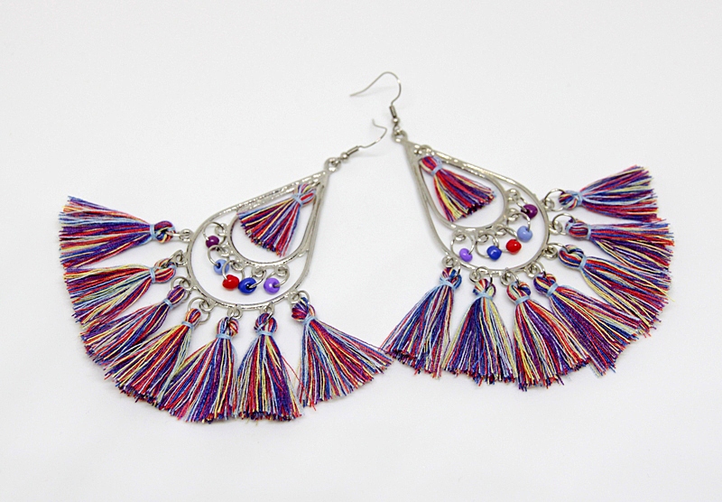 Hõbedavärvi metalldetailide, triibuliste puuvillaniidist tuttide ja väikeste värviliste klaashelmestega rahvuslikus stiilis kõrvarõngad. Kõrvarõngaste pikkus koos hõbedavärvi konksuga on 11 cm