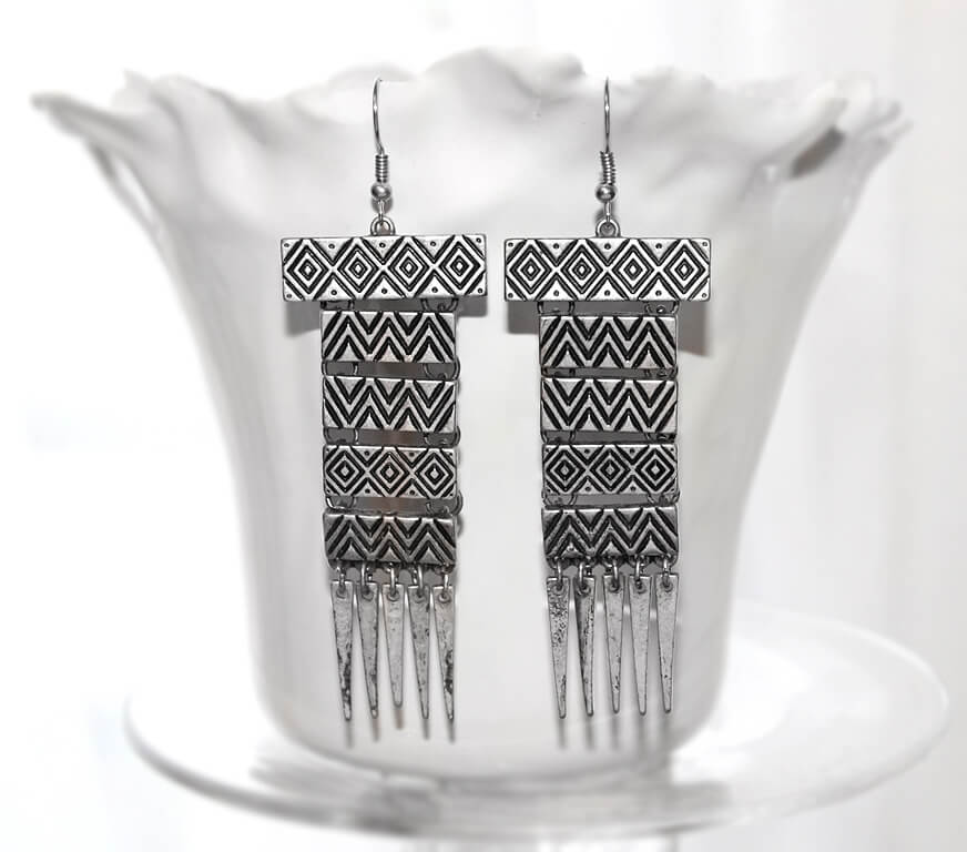 Reljeefsete etnomustriliste metalldetailide ja piik-ripatsitega rahvuslikel ainetel vanahõbedavärvi kõrvarõngad.