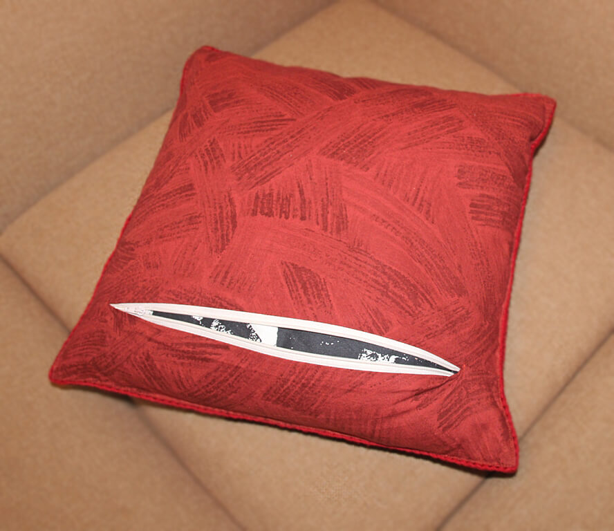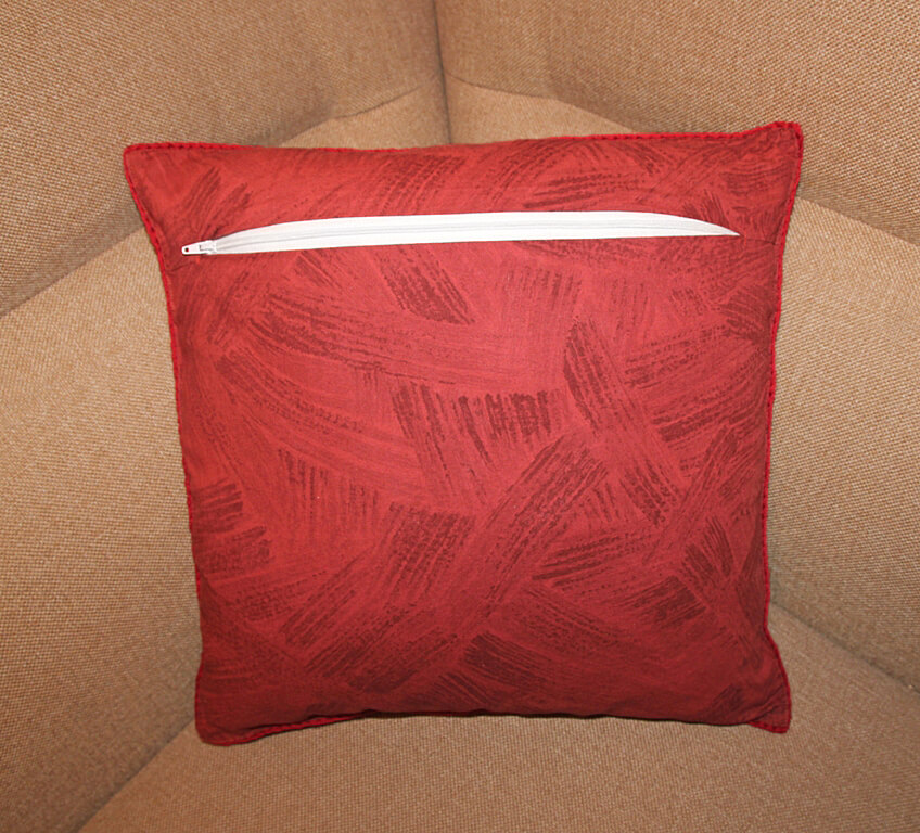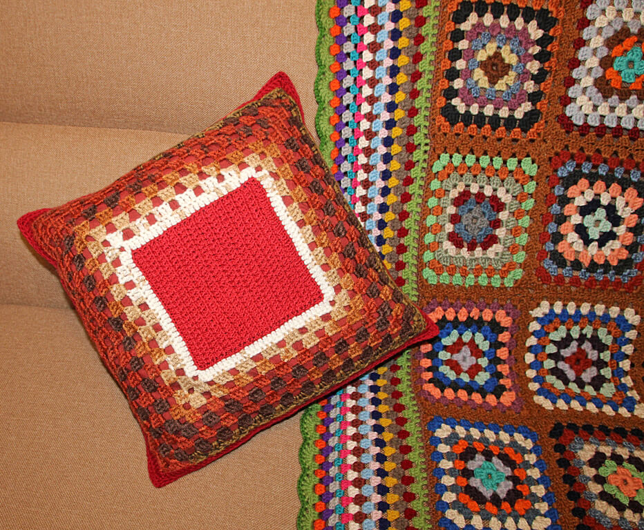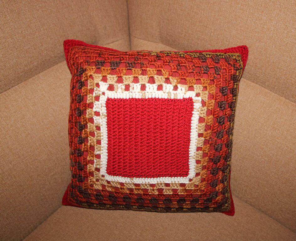 Heegeldatud osa keskel on ažuurne topeltsammastest reljeefne motiiv, ääred heegeldatud vanaema ruudu tehnikas kolmiksammastega. Pealiskate on õmmeldud õhemat sorti puuvillasele (sitsist) pruuni-punasekirjule aluskangale. Tagaküljel kontrasne valge kaunistuslukk, mille abil on lihtne padjalt katet eemaldada ja puhastada.