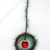 Säravast punase-rohelisekirju narmas-efektlõngast ümber tugeva metallrõnga heegeldatud kaunistusriputis väikese säravpunase jõulumunaga.