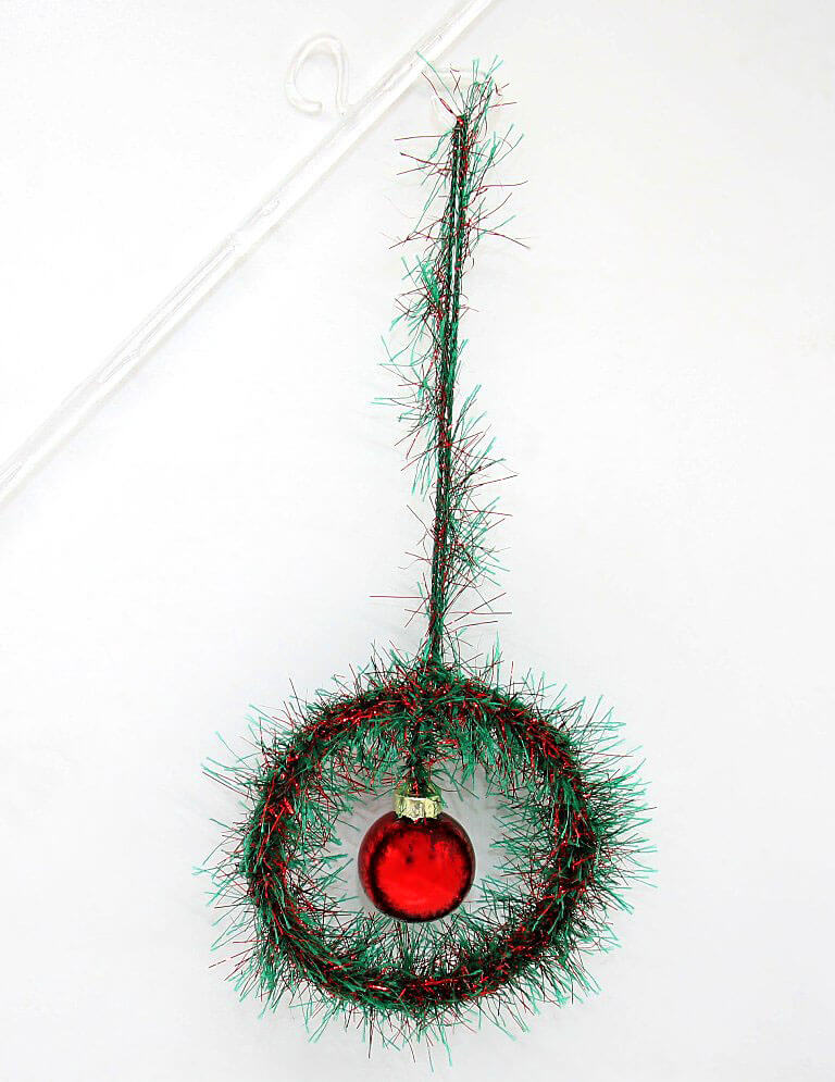 Säravast punase-rohelisekirju narmas-efektlõngast ümber tugeva metallrõnga heegeldatud kaunistusriputis väikese säravpunase jõulumunaga.