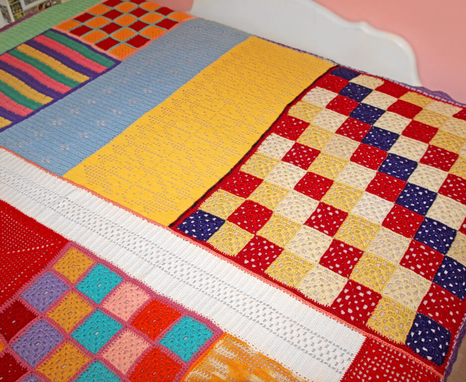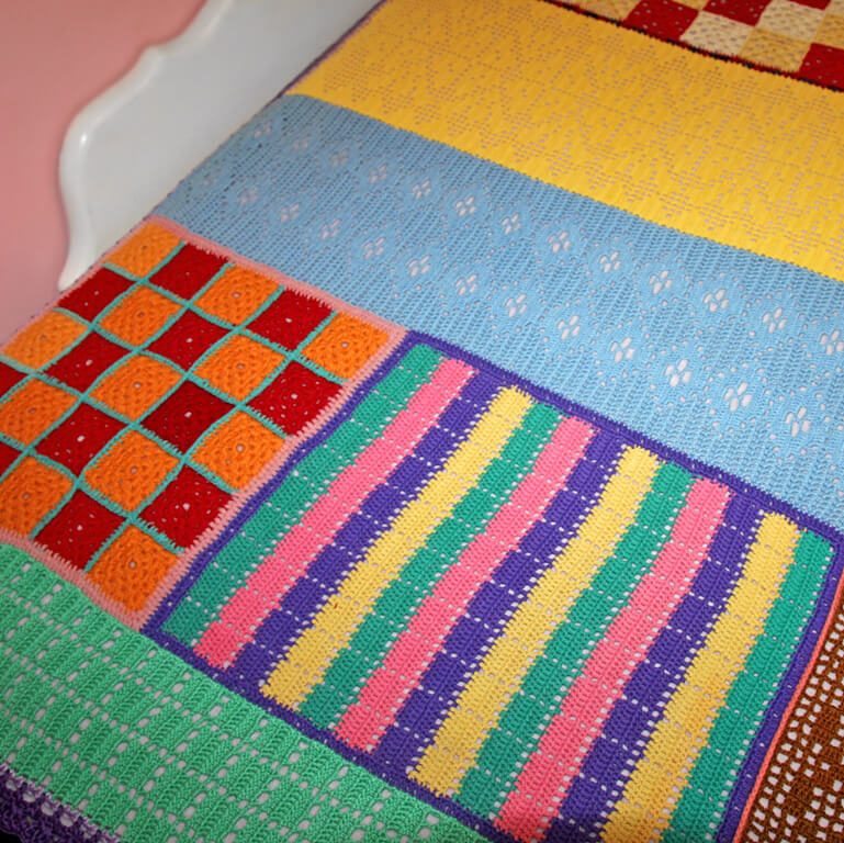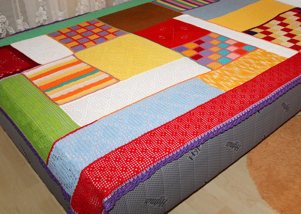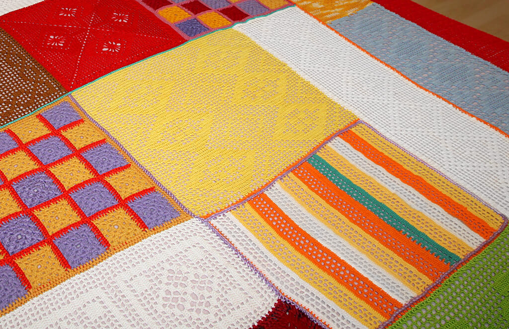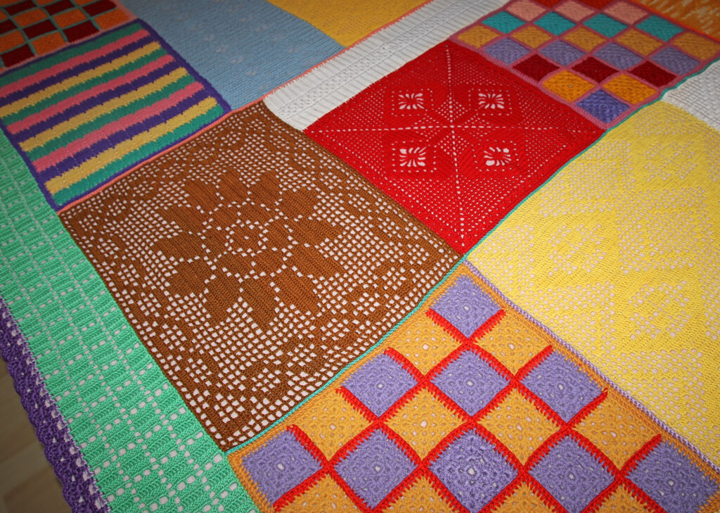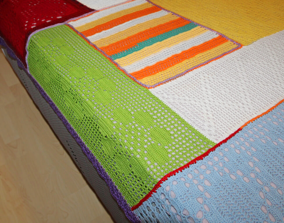 Erineva mustri ja suurusega neljakandilistest erivärvilistest heegeldatud detailidest suur ja värvikirev päevatekk.