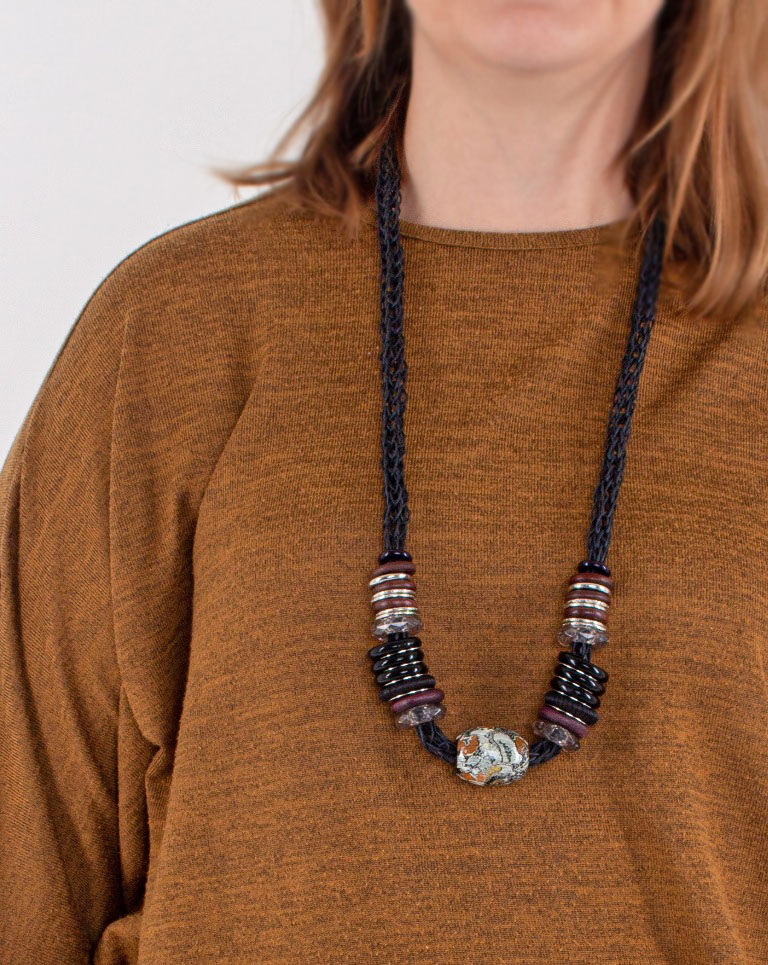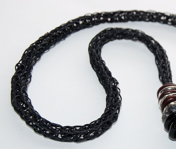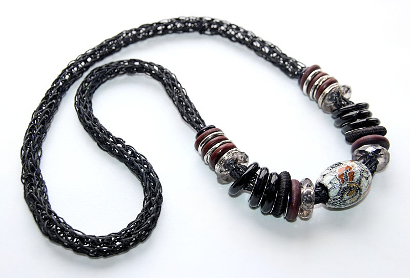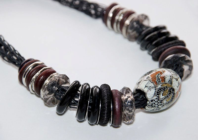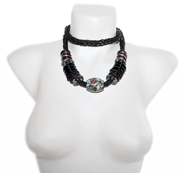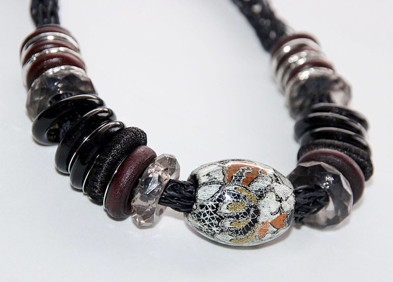 Peenest puuvillasest musta värvi niinest heegeldatud pitsilise nööri ja erinevate plast-, puu- ja metallrõngastega kaelakee. Kaelakee keskel on kaunistuseks efektne sädelusega pitsimustriline akrüülhelmes suurusega 2,5 cm x 3 cm. Kaelakee rõngaid saab nööril liigutada ja sättida vastavalt soovile kas kõik kokku või jätta rõngaste ja keskmise helme vahele ka “õhku”. Heegeldatud nööril seisavad rõngad ilma eraldi kinnituseta.