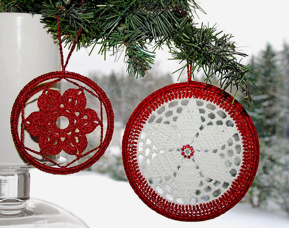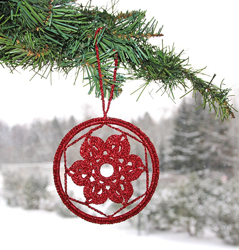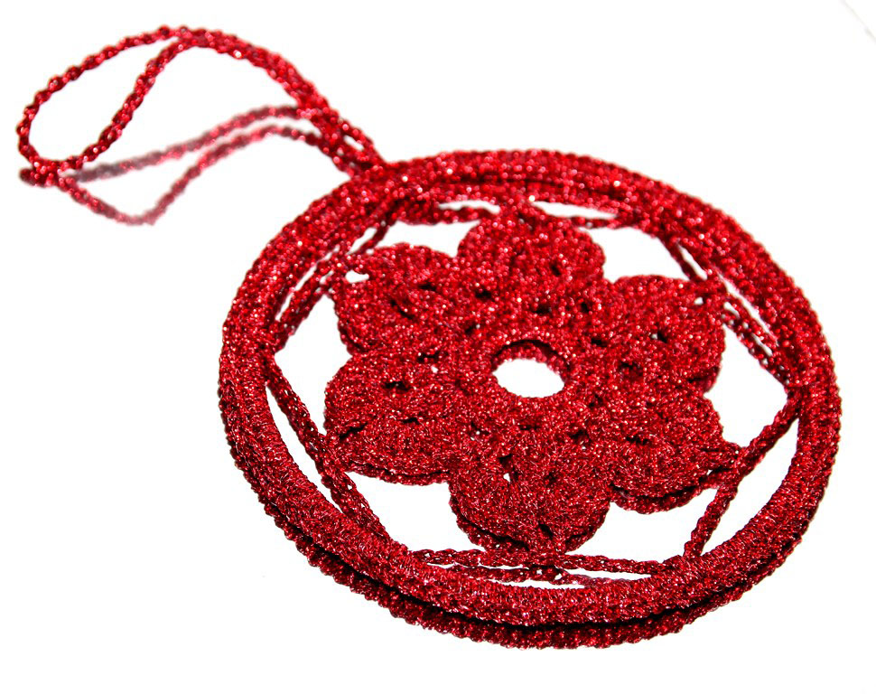Säravast punasest metalliklõngast ümber tugeva metallrõnga heegeldatud lilleõiemotiiviga kaunistusriputis.