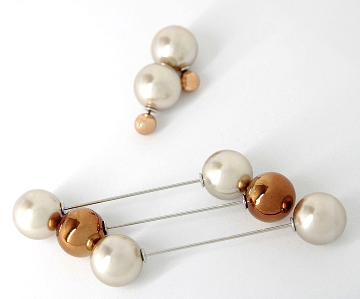 Komplekti kuuluvad neli beežikas halli pärlit ja kaks kuldpruuni metalliläikelist helmest 16mm. Pärlid ja helmed on kinnitusnõela mõlemast otsast äravõetavad, mistõttu saab neid omavahel ka erinevalt kombineerida. Samuti saab ühendusnõelaga pärleid kasutada näiteks prossina rinnas või kinnitusnõelana kampsuni-pluusi-džempri revääril ja mansetil (vt erinevaid kasutusvõimalusi galeriis olevalt näidispildilt)
