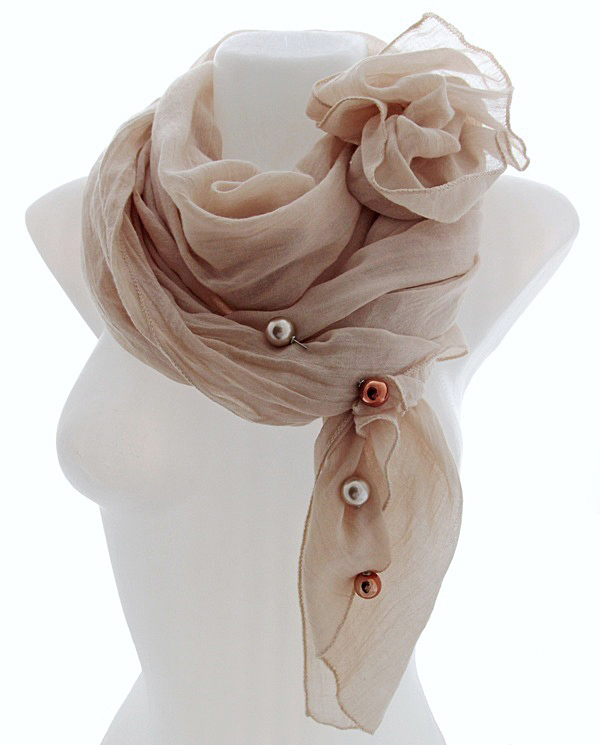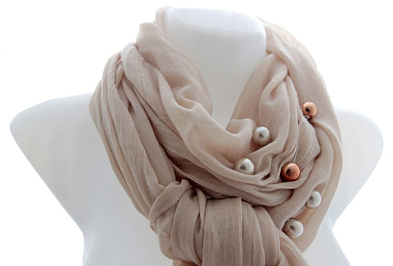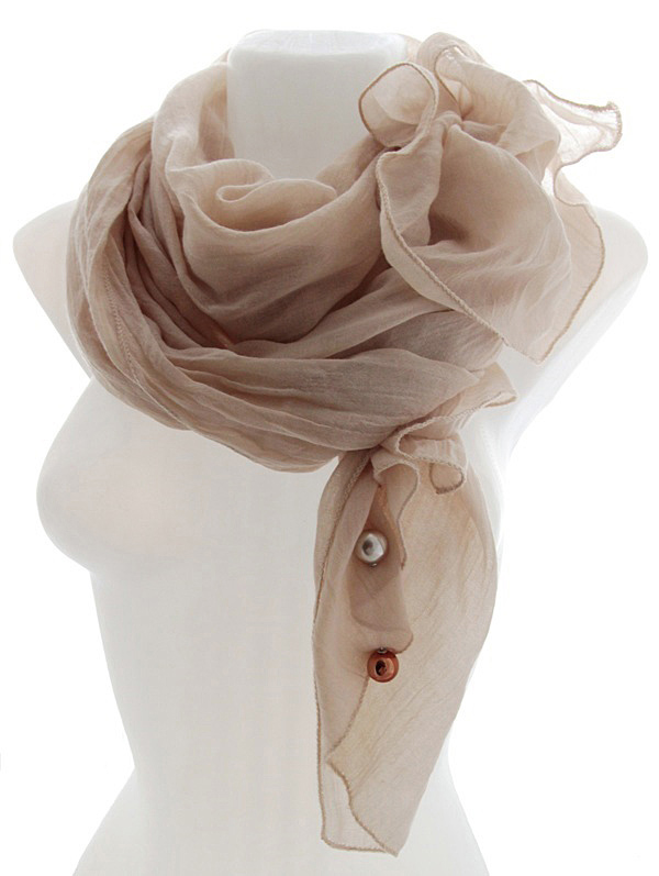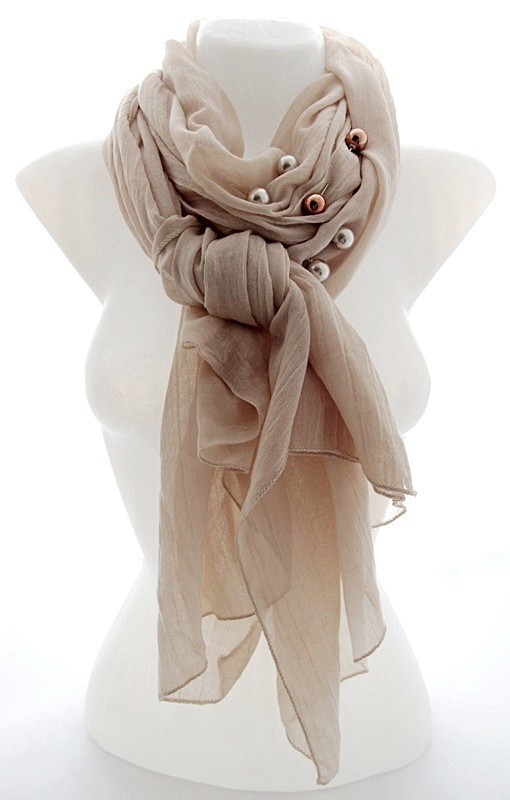 Pastelset tooni helebeežist viskooskangast suuremat sorti sall pärlitest kolme kaunistusnõela ja kahepoolsete pärlkõrvarõngastega. Mõnusalt pehme ja õhulise salli mõõdud on 73 cm x 193 cm. Beežikas-hallide pärlite läbimõõt on 16mm, väiksema kuldpruuni helme suurus on 7mm. Väikse helmega poltkõrvarõngaid on võimalik kanda ka ilma tagumise pärlita (kaasas 1 paar poldi kinnitustaguseid).