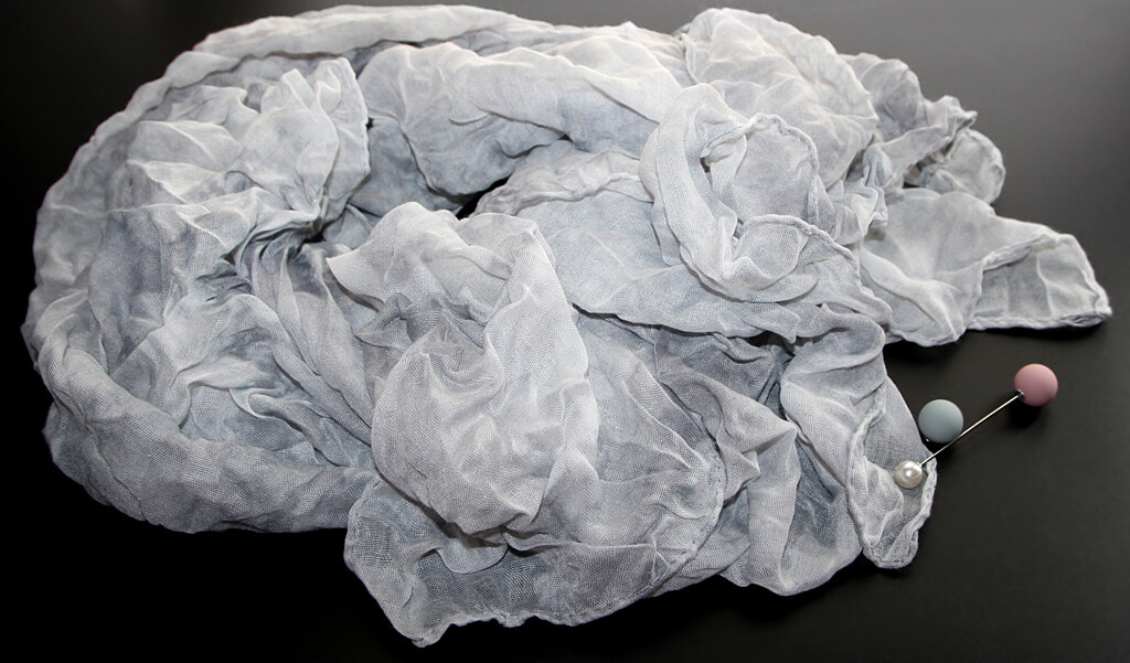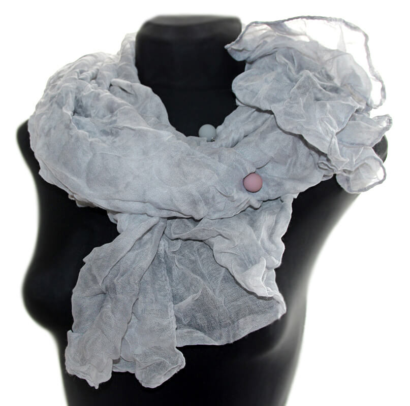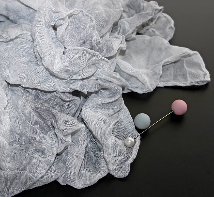 Batika tehnikas värvitud sulanduvates hallides toonides suuremat sorti sall valge pärli ja pastelltoonides helmestest kaunistusnõelaga. Salli kangas on efektselt ja üsna tugevalt kortsutatud.