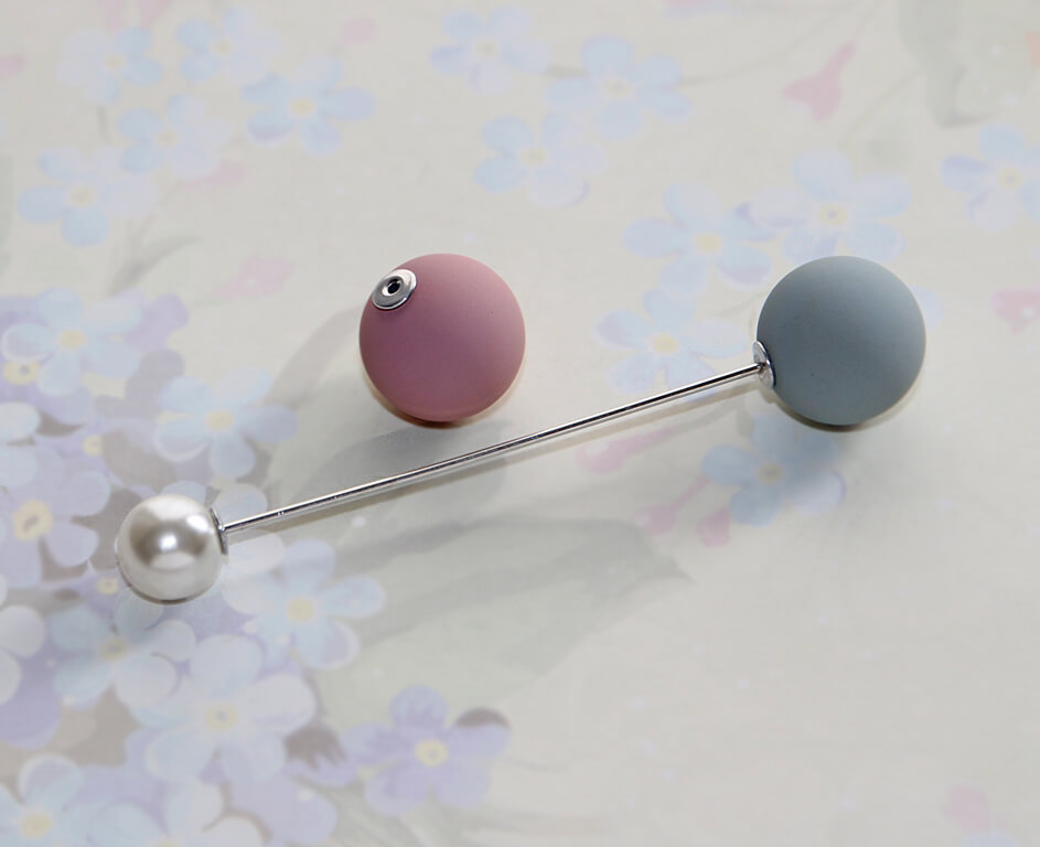 Komplekti kuuluvad üks (kergelt kreemika tooniga) valge akrüülpärl suurusega 8mm, üks vanaroosa ja üks hall silikooniga kaetud auguga ühe auguga helmes. Kauni mati pinnaga roosa ja halli helme suurus on 16mm.