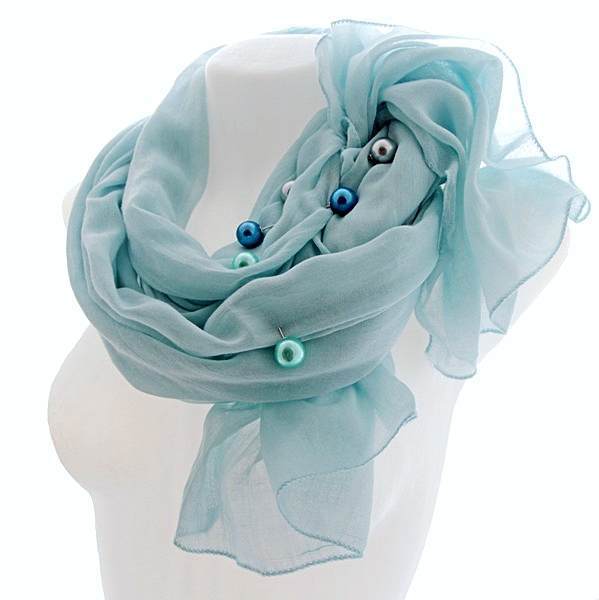 Pastelset tooni helesinisest viskooskangast suuremat sorti sall pärlitest kolme kaunistusnõelaga. Mõnusalt pehme ja õhulise salli mõõdud on 73 cm x 193 cm.