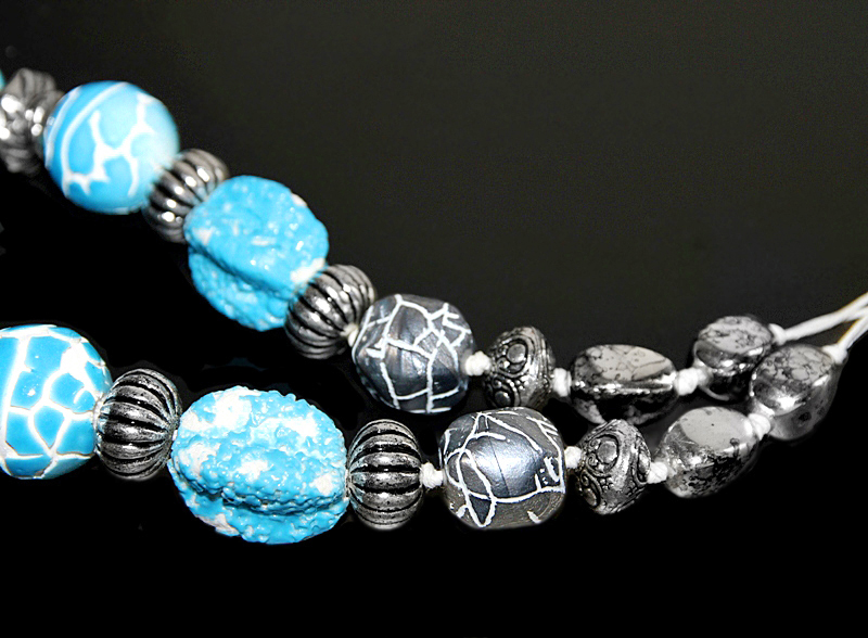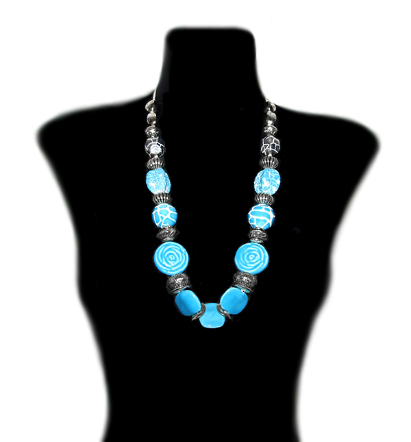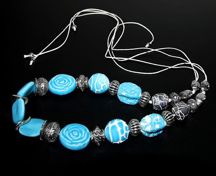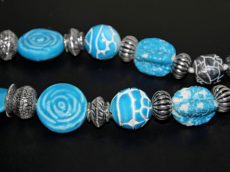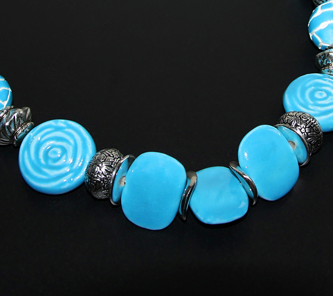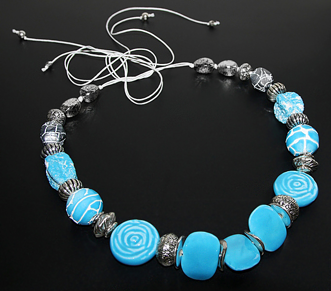 Erineva kujuga suurte taevasinise glasuuriga kaetud efektsete savihelmeste, antiikhõbedavärvi kaunistusdetailide ja naturaalvalge puuvillanööriga kaelakee. Käsitööna valminud keraamiliste helmeste suurus on keskmiselt 3 cm, suure roosimotiiviga ümmarguse helme diameeter on 3,5 cm. Antiikhõbedavärvi vahehelmed ja “mõralise” mustriga hallid helmed on kergest akrüülmaterjalist.