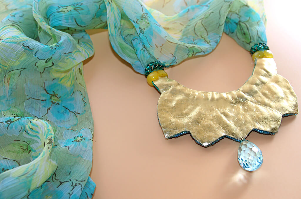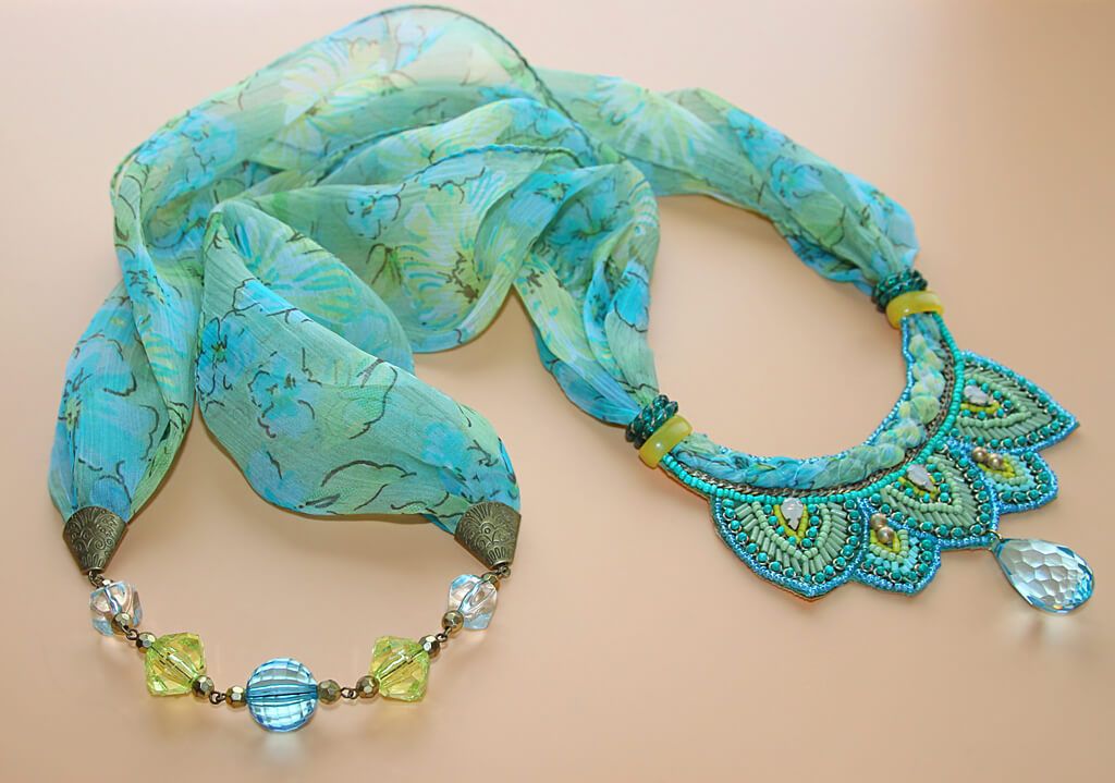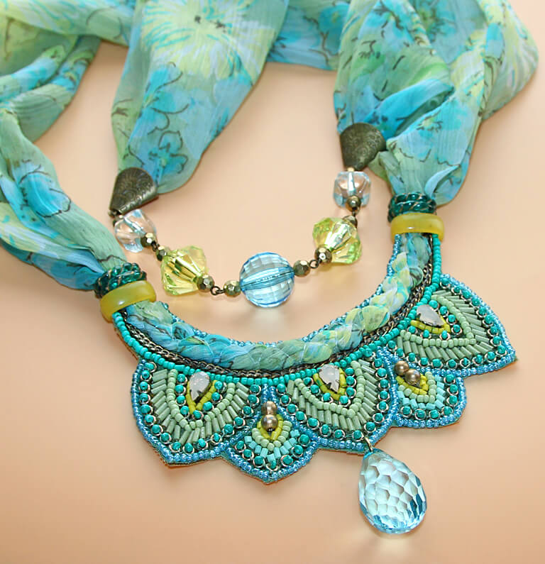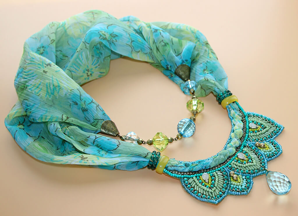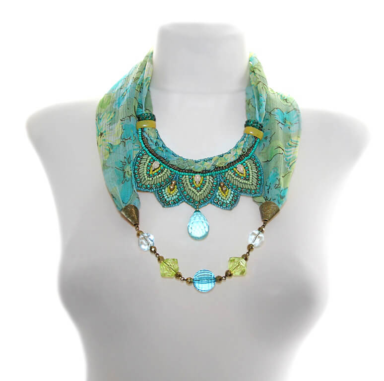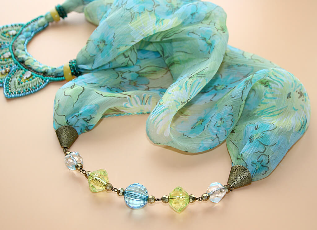Türkiisivärvi lillekirjust šifoonkangast ning kanga otstesse kinnitatud helmekee ja helmestikandis kaunistusdetailiga efektne kaelaehe.