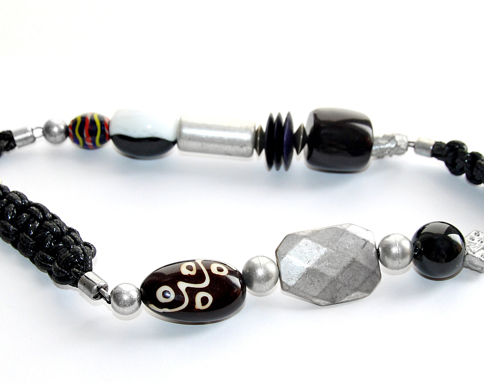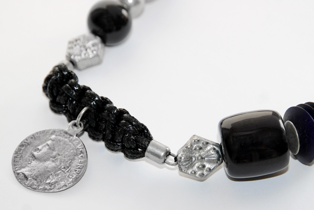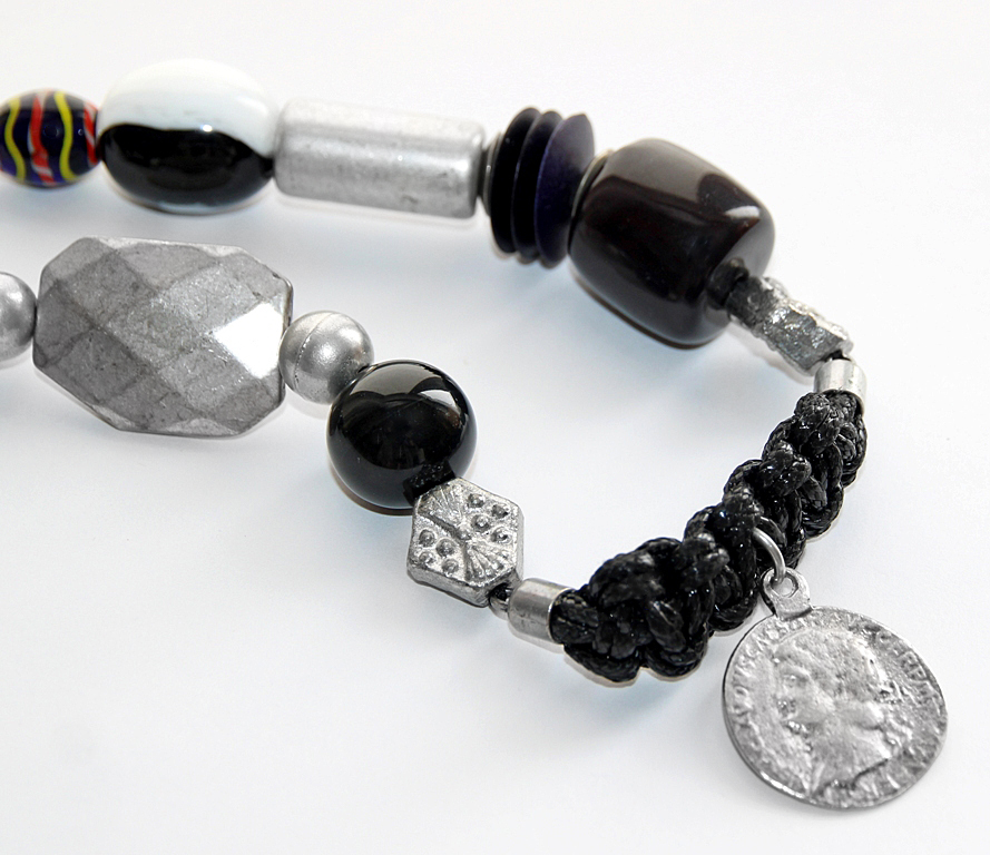 Kirju klaashelme, mustast paelast punutiste, erinevate akrüülhelmeste, vanahõbedavärvi metallhelmeste ja “tinaplommidega” etno stiilis suur ja efektne “hõbemündiga” kaelaehe. Stiliseeritud ja Vana-Kreeka hõbemünti kujutava metallripatsi diameeter on 32mm.