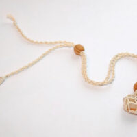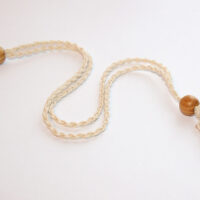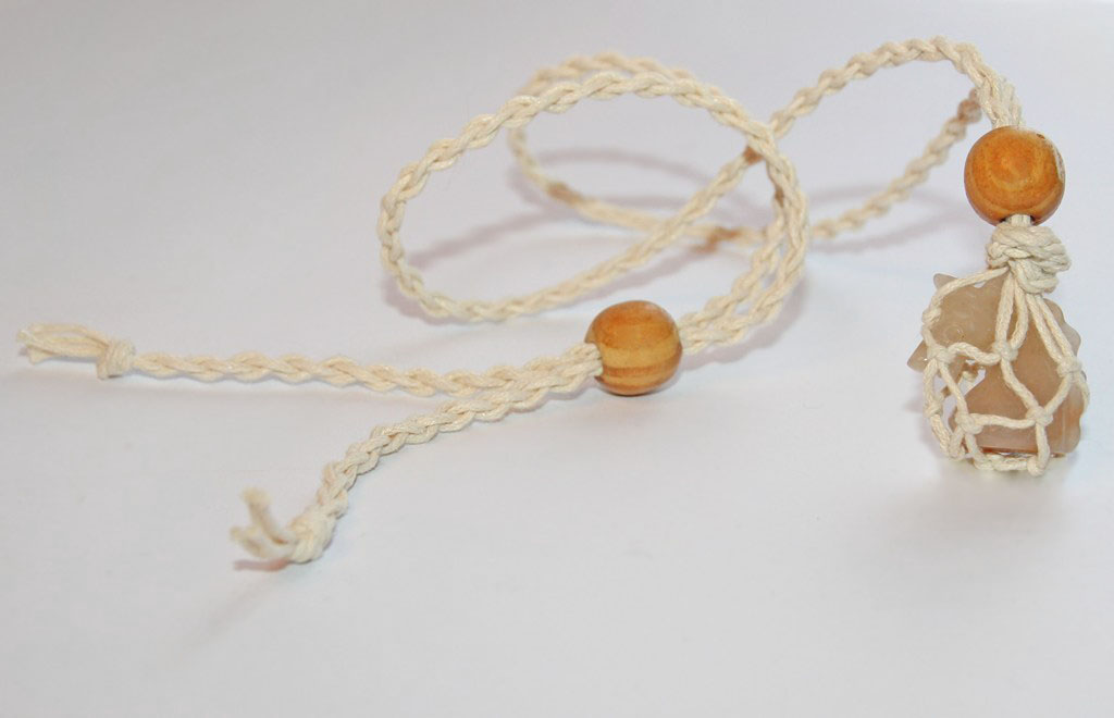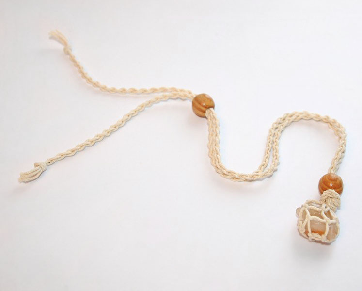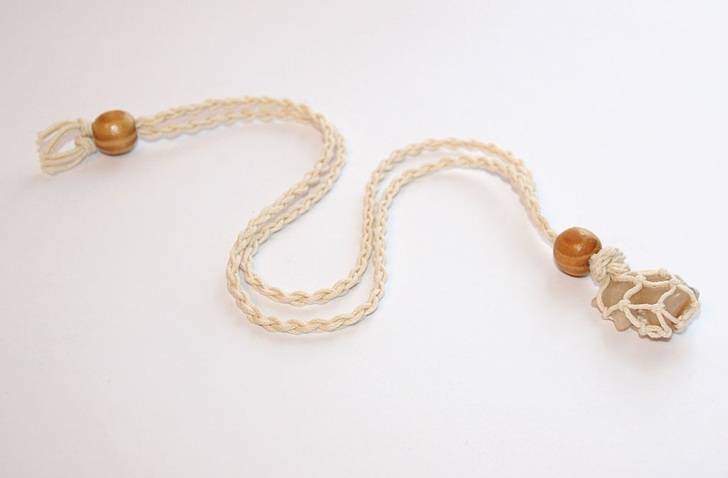 Naturaalvalgest puuvillanöörist võrkpunutise, heledate lakitud naturaalsest puidust helmeste ja kollakas-valgest ahhaadist hobuse pea kujulise kiviga kaelaehe.