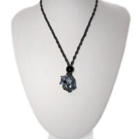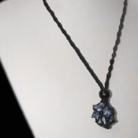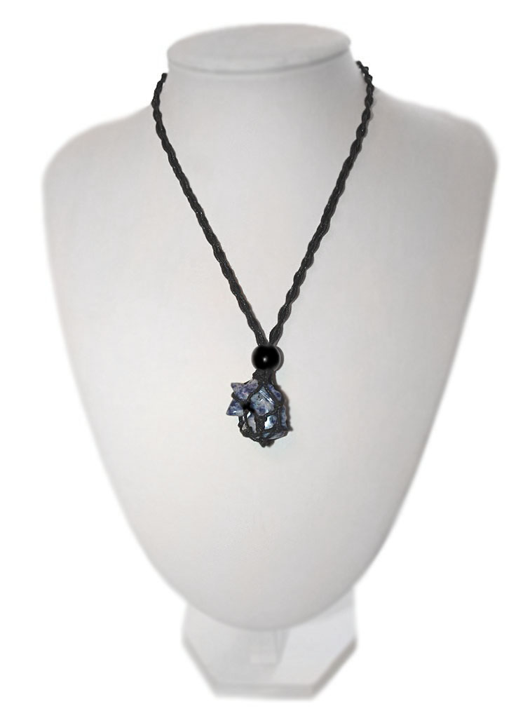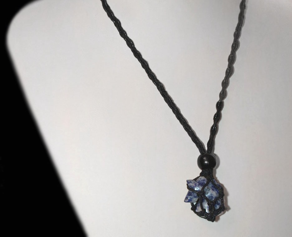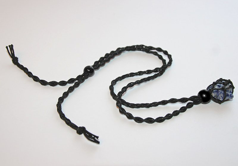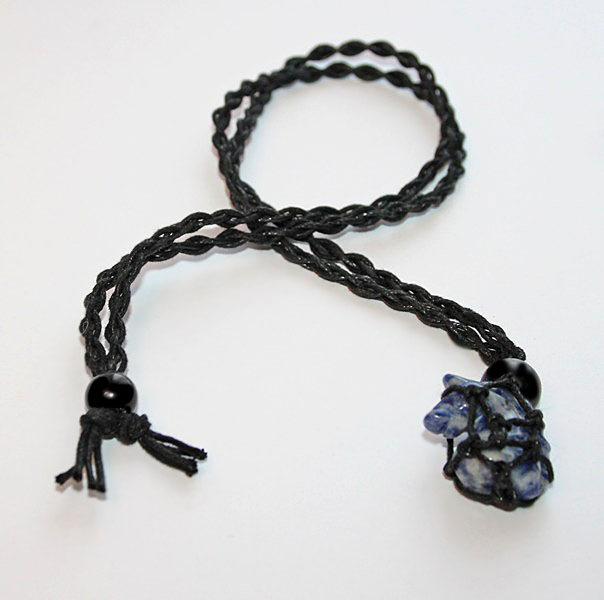 Mustast puuvillanöörist võrkpunutise, mustade puuhelmeste ja sodaliidist hobuse pea kujulise kiviga kaelaehe.