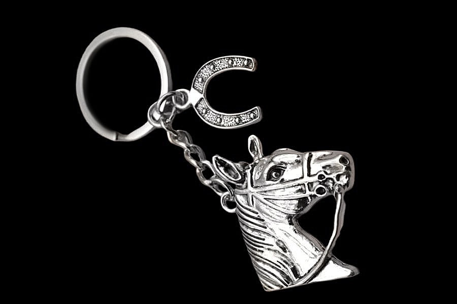 Keti külge kinnitatud hobuse pea kujulise metallripatsi ja rõnga külge kinnitatud hobuserauakujulise kaunistusdetailiga hõbedavärvi võtmehoidja.
