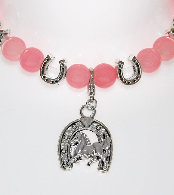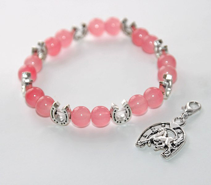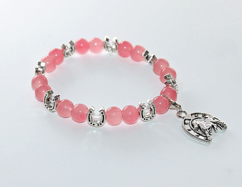 Kaunite tumeroosade kirsi (cherry) kvartsi helmestega käevõru hobuserauakujuliste hõbedavärvi metallist vahedetailide ja hobuse motiiviga ripatsiga.