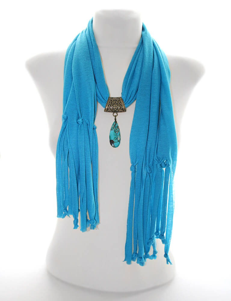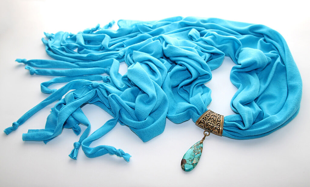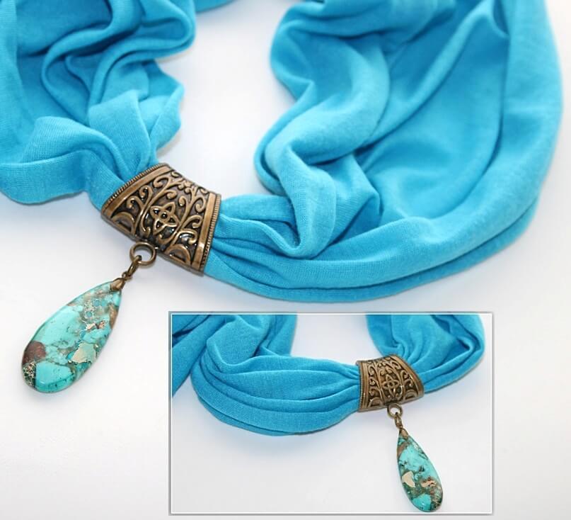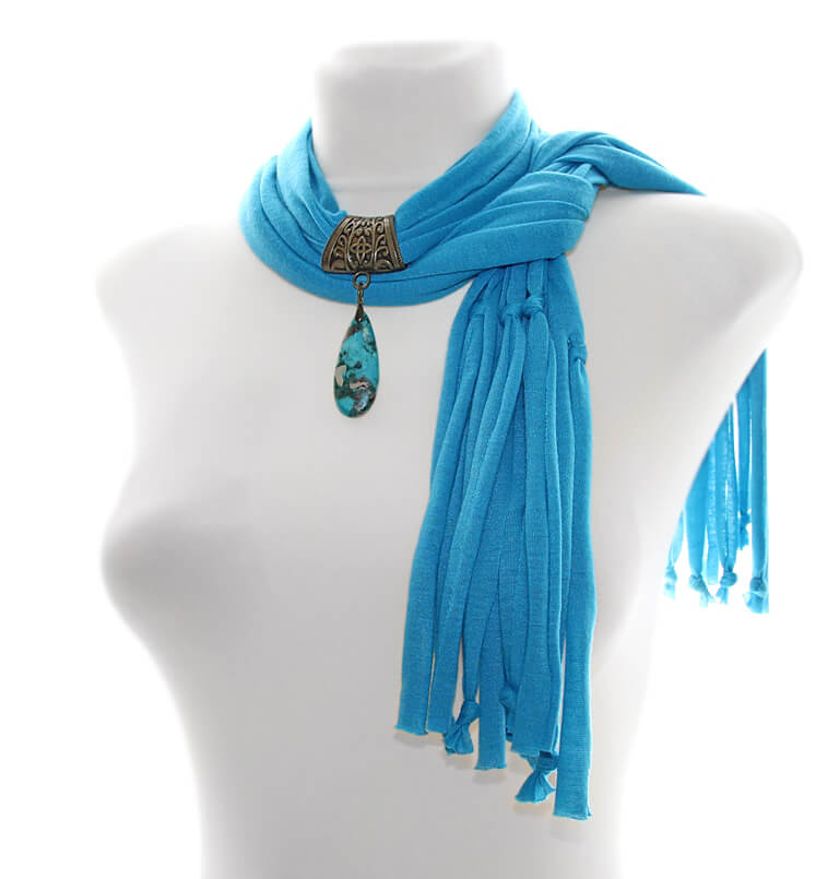 Erksat taevasinist värvi trikotaažkangast sall pronksivärvi sallikaunistuse ja sinistes-pruunides toonides jaspise segu mosaiik-kivist ripatsiga.