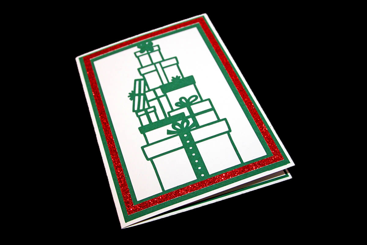 Kahepoolne tugevast valgest kartongist käsitööna valminud reljeefne (mitmekihiliste kaunistusetga) jõulukaart “kingipakikuhjaga”. Kaardi serv on kaunistatud punase glitterpaberiga.