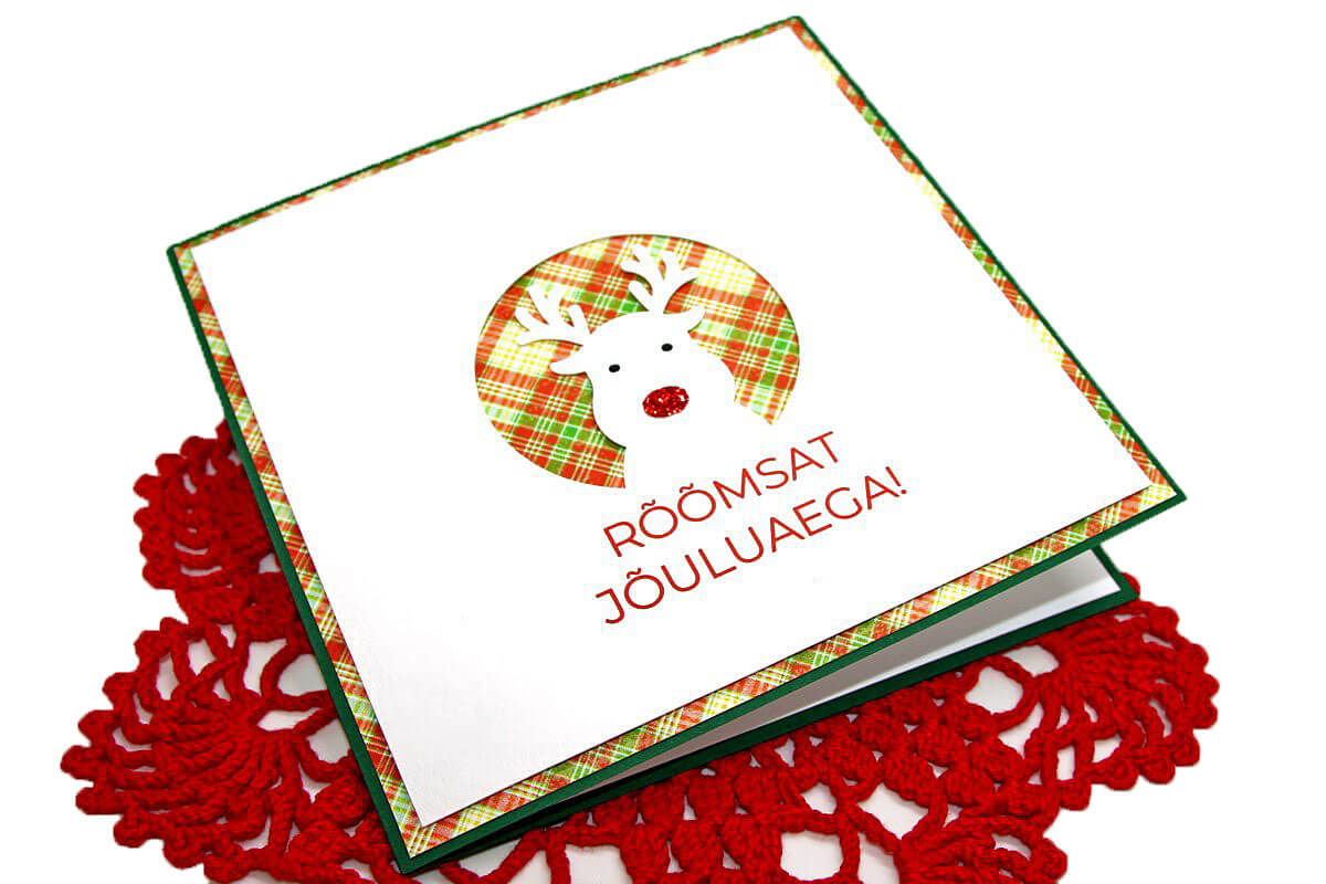 Kahepoolsest tugevast tumerohelisest kartongist kahekihilise pealsega (valge pealispaberi all on ruuduline kaunistuspaber) vahva jõulukaart põhjapõdra motiiviga. Kaart on seest üleni valge.