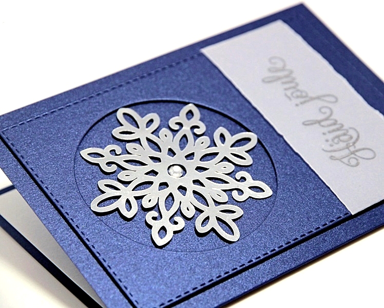 Sädelev tumesinine jõulukaart suure hõbedase lumehelbekujulise pitsdetailiga