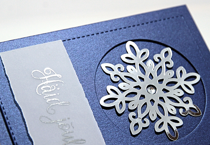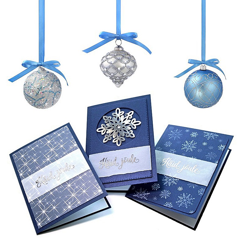 Tumesinisest kergelt sädelevast kartongist kahepoolne jõulukaart reljeefse ümmarguse väljalõike, suure hõbedaselt läikiva lumehelbekujulise pitsdetaili ja läbipaistvast mattpaberist “rebitud” servadega kaunistusribaga. Kaunistusribale kirjutatud jõulusoov on hõbedases fooliumtrükis. Lumehelbe südamikuks väike särav klaaskristall. Kõrgema pealisdetaili servad on stiliseeritud “masinõmblusega”. Seest on kaardi üks külg valge ja teine tumesinine. Kaardi mõõdud on 10 cm x 15 cm.