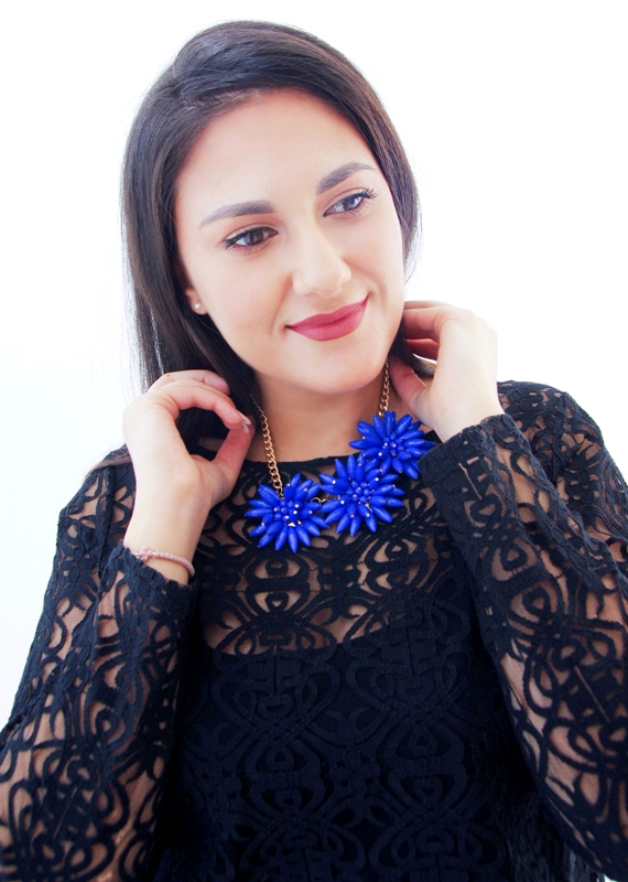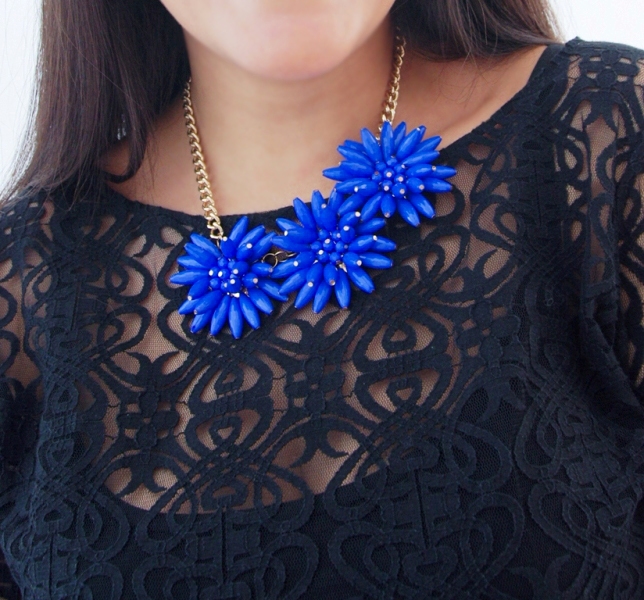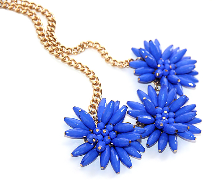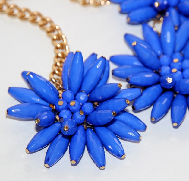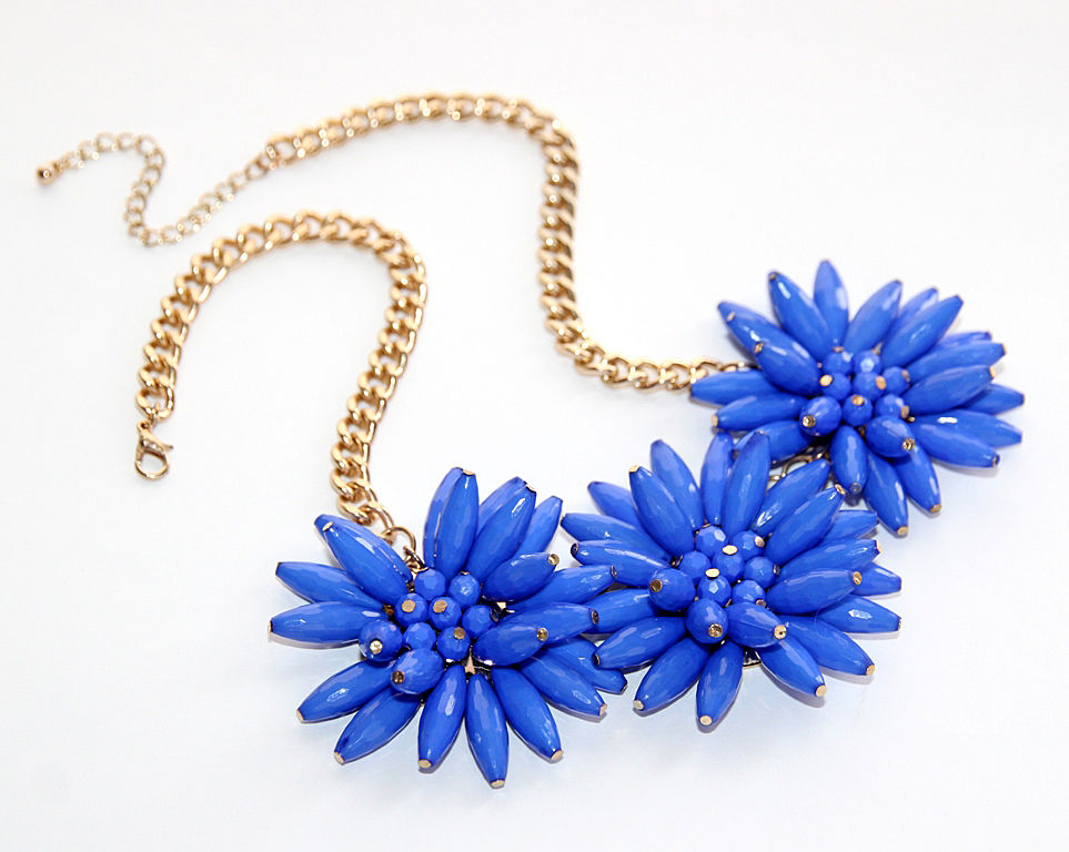 Kullavärvi keti ja kolme suure erksinistest akrüülhelmestest rukkilillemotiiviga efektne kaelaehe. Kaelaehte pikkus on reguleeritav kuni 50 cm-ni. Väikest karabiinhaaki saab kinnitada igasse ketilülisse. Lillemotiivi diameeter on 5 cm, kolme motiiviga detaili pikkus on 15 cm.