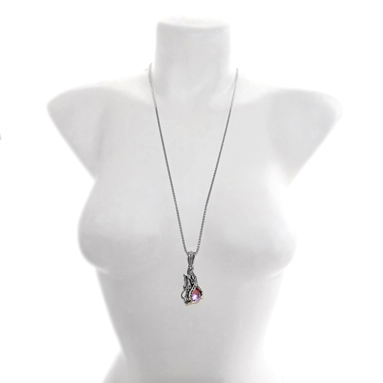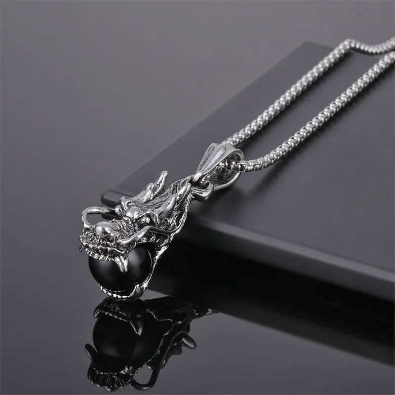 Efektse antiikhõbedavärvi draakoni pea kujulise metalldetaili ja musta klaaskuuliga kaelakett-võtmehoidja. Ripatsi pikkus koos riputushaagiga on 5 cm. Draakoni “hambus” oleva värvitud klaaskuuli diameeter on 14mm. Antiikhõbedavärvi metallketi kinniseks on väike rõngas ja karabiinhaak, kaelaketi pikkus on 69 cm (NB! Kaelakett on nii piisavalt pikk, et tuleb üle pea ka ilma karabiinhaaki lahti tegemata).