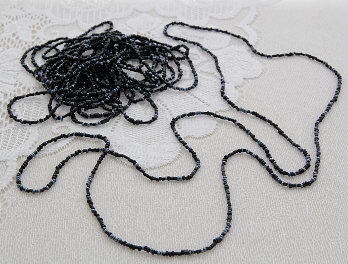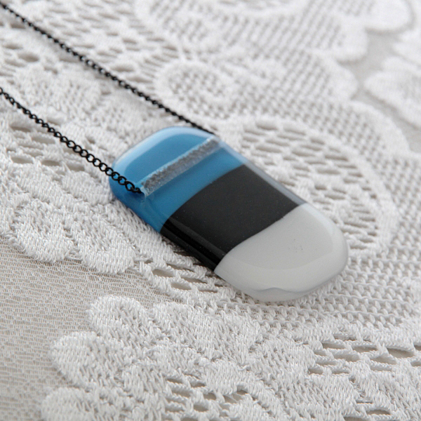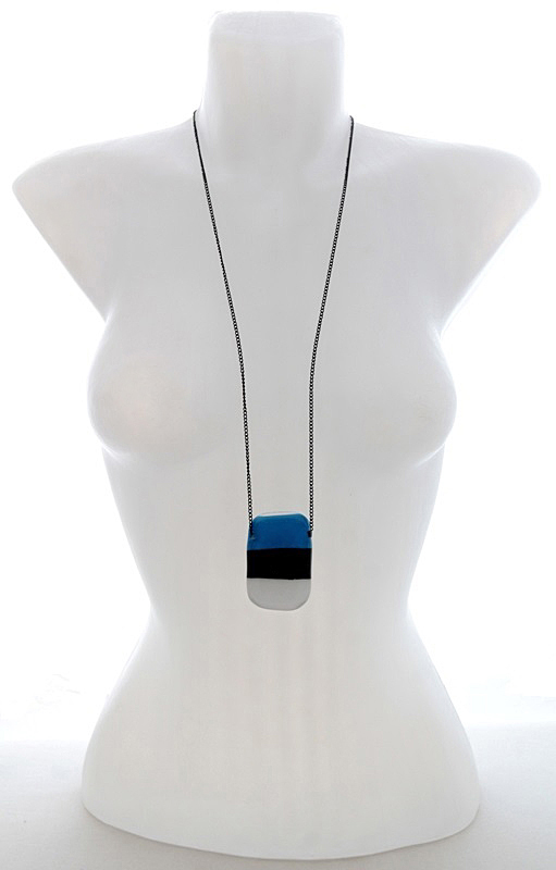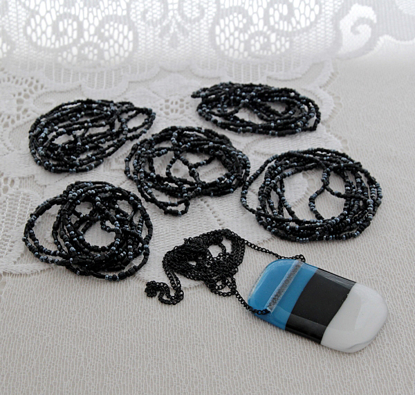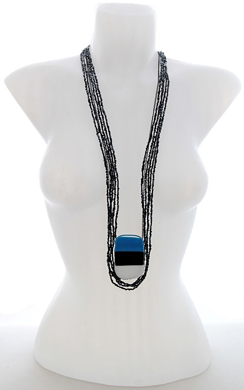 Sini-must-valgetes värvides käsitööklaasist suure ripatsi, musta peenikese keti ja mustadest ning sinakas-hallidest seemnehelmestest kaelakeede komplekt. Komplekti kuulub viis üksikut säravatest väikestest seemnehelmestest kaelakeed, mida saab kanda pikana koos klaasripatsiga kaelaketiga või mitmekihilisena kahekordselt ümber kaela. Samuti saab kõiki komplekti kuuluvaid kaelakeesid kanda üksikult. Klaasripatsi mõõdud on 4,2 cm x 6,5 cm. Keti täispikkus (ümbermõõt) koos ripatsiga on 110 cm. Seemnehelmestest kaelakeede pikkus on 118 cm